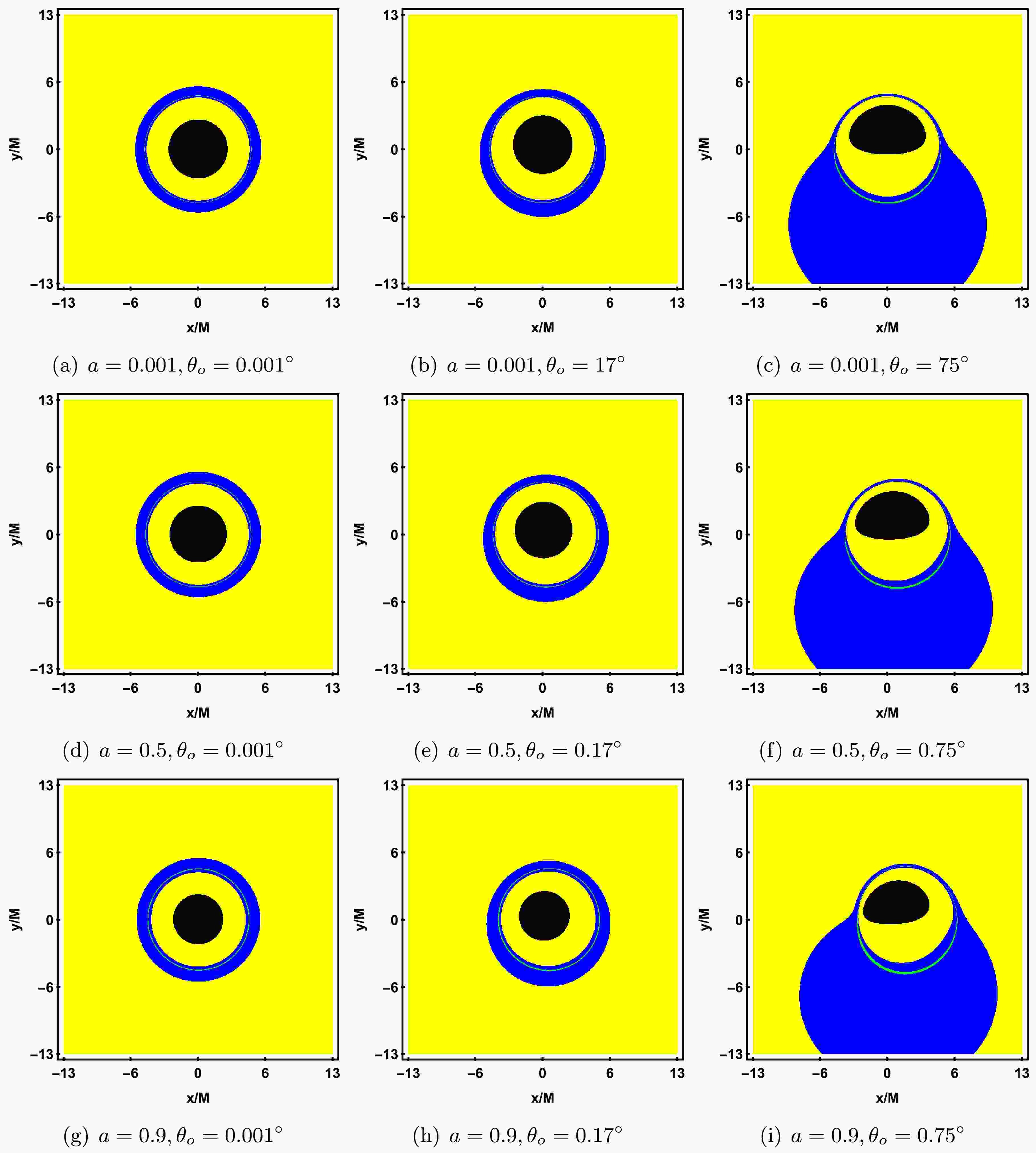 It is important to note that in the optical image of a black hole, variations in the number of times light ray traverses the accretion disk result in distinct images due to the cumulative effect of light intensity at each passage. Specifically, the primary image (direct image) corresponds to the case where $ n = 1 $, the secondary image (lensed image) corresponds to $ n = 2 $, and paths involving three or more crossings correspond to higher-order images (photon rings). The definition of photon rings is generally subject to variation. For instance, according to Refs. [84, 85], the photon ring includes all images located outside the direct image. In contrast, Refs. [41, 42] define the term more narrowly, referring specifically to images situated beyond both the primary and secondary images. In this work, we adopt the definition provided in the latter set of references. To better distinguish between direct and lensed images in the shadow image, we plot the observed fluxes in Figure 12. The yellow, blue, and green regions in the image correspond to direct image, lensed image and the photon ring, respectively. For all parameter values, the range of direct image is the widest, while the photon ring always lies within the range of lensed image. When $ \theta_o \to 0^{\circ} $ (the first column), lensed image and the photon ring form concentric circular structures, with the center located at the origin and coinciding with the center of the inner shadow. As a increases, the radius of the rings slightly decreases but remains symmetrical. When $ \theta_o $ increases to $ 17^{\circ} $ (the second column), lensed image and the photon ring shift towards the negative half of the y-axis, and the rings are no longer symmetrical. As $ \theta_o $ further increases to $ 75^{\circ} $ (the third column), both the inner shadow, lensed image, and the photon ring undergo significant deformation. The range of lensed image greatly increases, mainly concentrated in the lower half of the screen, with less distribution in the upper half. Additionally, the photon ring becomes more prominent in the lower half of the screen. These deformations become more pronounced as a increases. The above analysis indicates that the observer's inclination angle $ \theta_o $ has a significant impact on the black hole shadow image, especially the size of the inner shadow and the distribution of the lensed image.