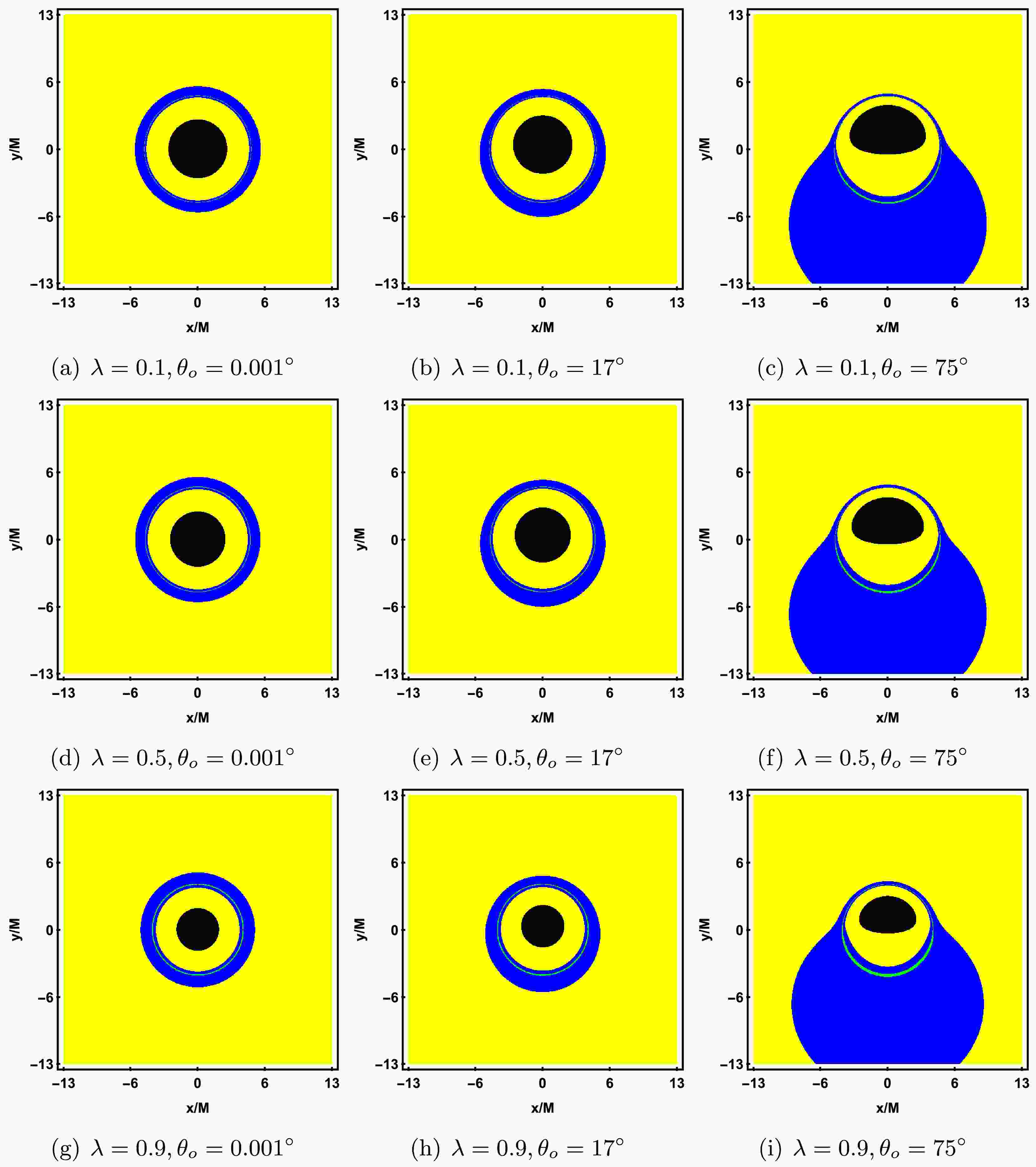 Figure 14.  (color online) Observed flux of the direct image, lensed image, and photon ring with a prograde thin accretion disk in KR gravity. The black, yellow, blue, and green regions correspond to the inner shadow, direct image, lensed image, and photon ring, respectively. Each row shows the gradual increase of λ, and each column shows the gradual increase of the observer's inclination angle $ \theta_o $. The other parameters are fixed as $ M = 1, a = 0.001, {\cal{G}} = 0.9 $.