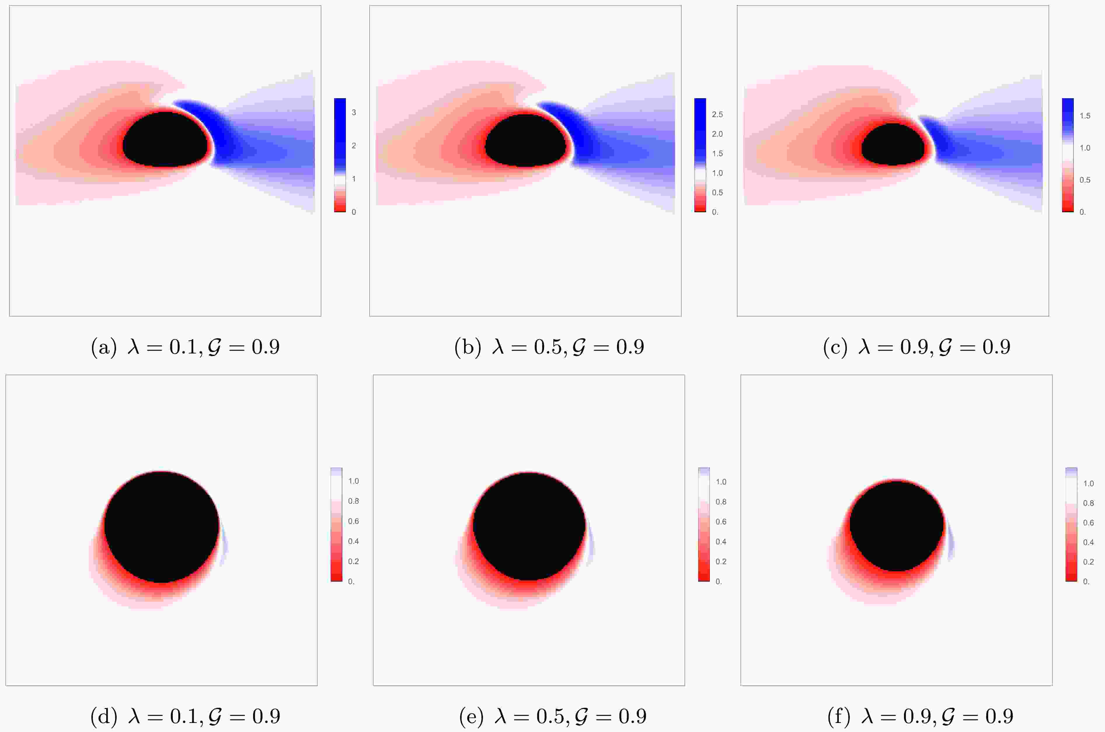 The redshift factor distribution of direct and lensed images under the retrograde accretion disk is shown in Figure 20. Compared to the prograde accretion disk, the redshift and blueshift regions are reversed. This phenomenon arises from the change in the direction of motion of the accreting material relative to the observer in the retrograde accretion disk, which causes the redshift and blueshift regions to be reversed due to the Doppler effect. In the retrograde accretion disk, the blueshift region appears on the right side of the image, corresponding to the crescent bright area of the photon ring in the black hole shadow image, which is also on the right. Similar to the prograde case, as λ or $ {\cal{G}} $ increases, the size of the inner shadow gradually decreases, but its shape remains almost unchanged. At the same time, the blueshift region of direct image shifts to the right, further separating from the redshift region.