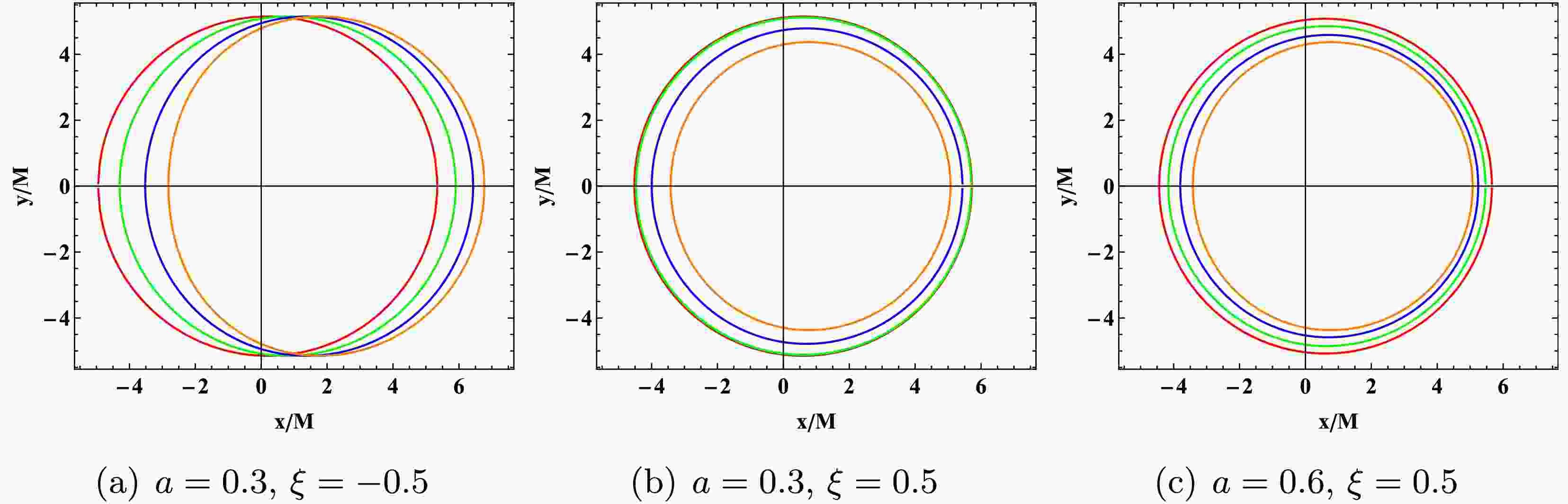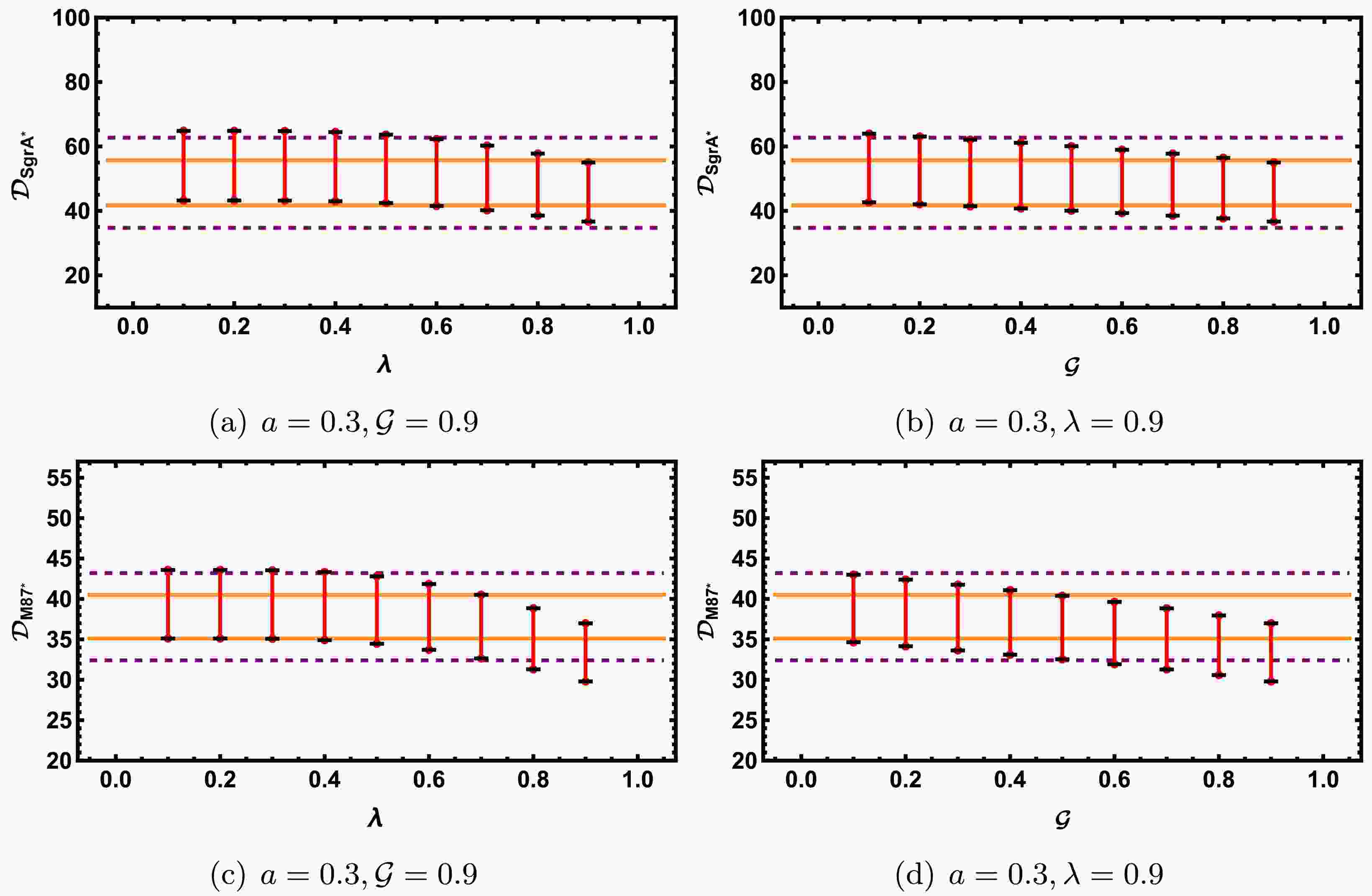 It is easy to see that the metric components do not contain t and ϕ, i.e., $ \dfrac{\partial g_{\mu\nu}}{\partial t} = \dfrac{\partial g_{\mu\nu}}{\partial \phi} = 0 $. Therefore, this is a stationary axisymmetric spacetime with two Killing vector fields $ \left(\dfrac{\partial}{\partial t}\right)^a $ and $ \left(\dfrac{\partial}{\partial \phi}\right)^a $. When $ {\cal{G}} = 0 $ and $ \lambda \neq 0 $ or $ \lambda = 1 $, the metric (8) reduces to the Kerr or Kerr-Newman black hole metrics, respectively. When $ a = 0 $, the metric (8) reduces to the static black hole metric (7). In this paper, we set the black hole mass $ M = 1 $ and specify values for a, λ, and $ {\cal{G}} $. By setting $ \Delta = 0 $, we obtain two solutions, $ r_{\pm} $, which correspond to the event horizon and Cauchy horizon, respectively. The term $ {\cal{G}} r^{\frac{2(\lambda-1)}{\lambda}} $ is found to play a crucial role in horizon dynamics. Variations in the parameters $ {\cal{G}} $ and λ can modify the structure of spacetime geometry, thereby influencing the characteristics of the black hole shadow. Current EHT observations of M87* and Sgr A* are capable of constraining the relevant parameters within alternative theories of gravity. Consequently, by analyzing the angular diameter and degree of deformation of the black hole shadow, permissible ranges for the parameters $ {\cal{G}} $ and λ can be established, as will be discussed in the following sections.