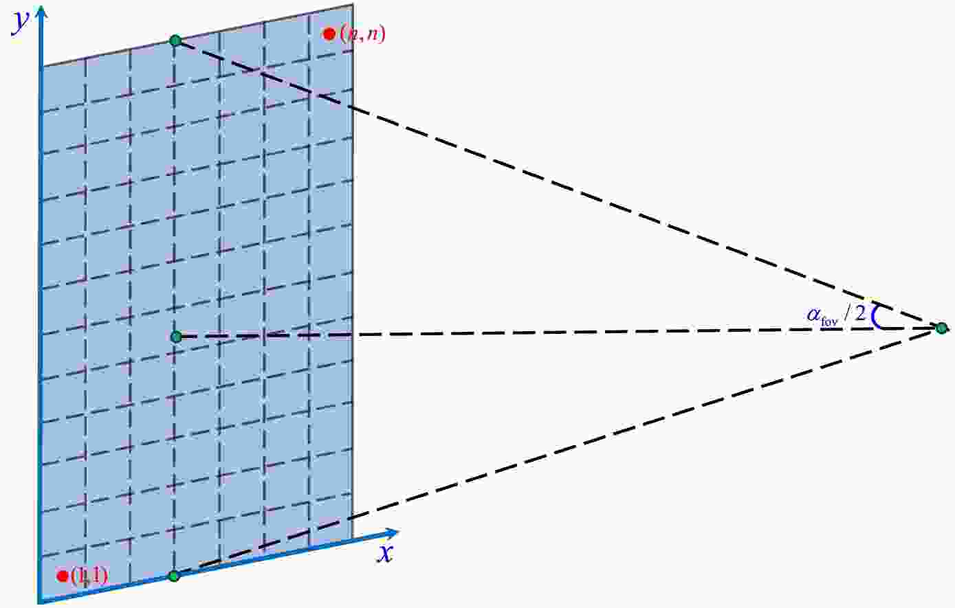 Figure 6.  (color online) Fisheye camera field of view with $ n \times n $ pixels, where the blue plane represents the imaging plane.