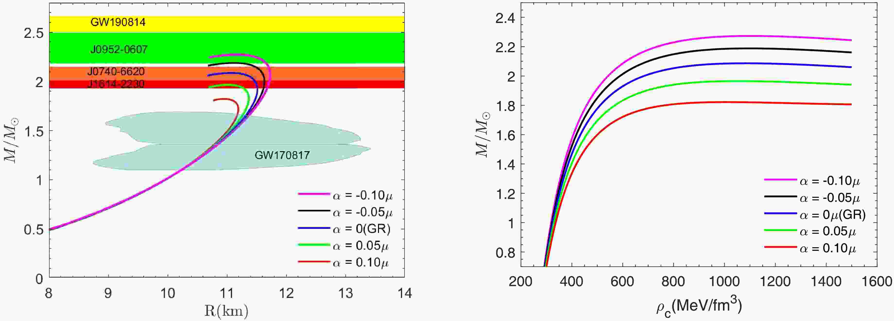 $ f(R,L_{m},T) $ gravity model. These figures also show the mass constraints of massive compact objects based on recent experimental observations. The red region, with a mass of$ M = 1.97 \pm 0.04M_{\odot} $ , represents the mass range constraint from PSR J1614-2230 [33]. The orange region, with a mass range of$ M = 2.08 \pm 0.07M_{\odot} $ , corresponds to the data from PSR J0740+6620 [84]. The green region, with$ M = 2.35 \pm 0.17M_{\odot} $ , is based on the data from PSR J0952-0607 [85]. The yellow region represents the mass range of the companion object in the gravitational wave event GW190814, with a mass range of$ 2.50-2.67M_{\odot} $ [34]. In Fig. 2, the mass-radius curves of quark stars are shown on the left for different values of the gravitational parameter α, with the parameters set as$ B = 70 $ MeV/fm3,$ m_{s} = $ 100MeV, and Δ =100MeV. The solid blue curve denotes the result from GR, while the other curves correspond to the case of the$ f(R,L_{m},T) $ gravity model, the relevant data are given in Table 1. We find that, compared to neutron stars [32], the structure of CFL quark stars is more sensitive to changes in the parameter α; even small variations in α can lead to significant changes in the mass and radius of quark stars. In the GR case, the quark star has a maximum mass of$ M = 2.09M_{\odot} $ and a radius of$ R = 11.05 $ km, and the mass-radius curve coincides with the data region of the pulsar PSR J0740+6620, which provides a theoretical explanation for the observations. As the value of α increases, both the maximum mass and its corresponding radius decrease. When α = 0.1 μ, a two solar mass compact star cannot be predicted; while when α = -0.1 μ, the quark star reaches a maximum mass of 2.27$ M_{\odot} $ with a corresponding radius of 11.19 km, which reasonably explains the observations of the pulsar PSR J0952-0607. In addition, the predicted radii corresponding to the observed masses of the four strange star candidates are presented in Table 2.