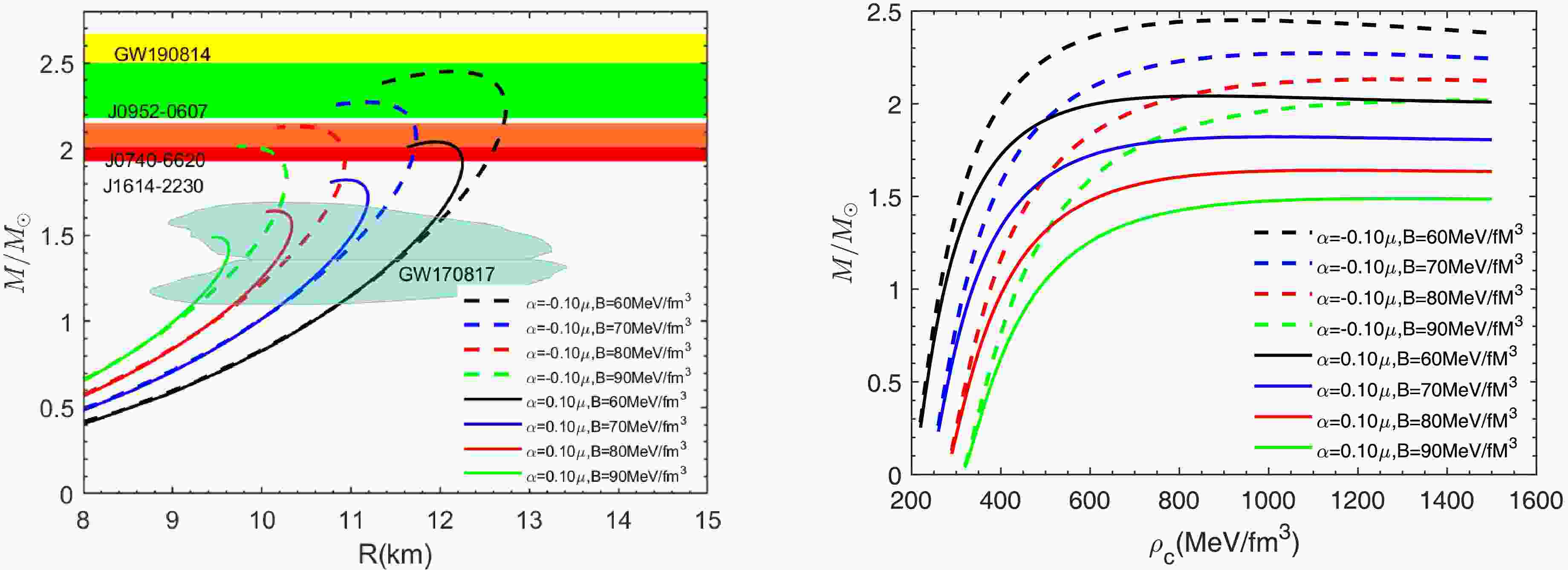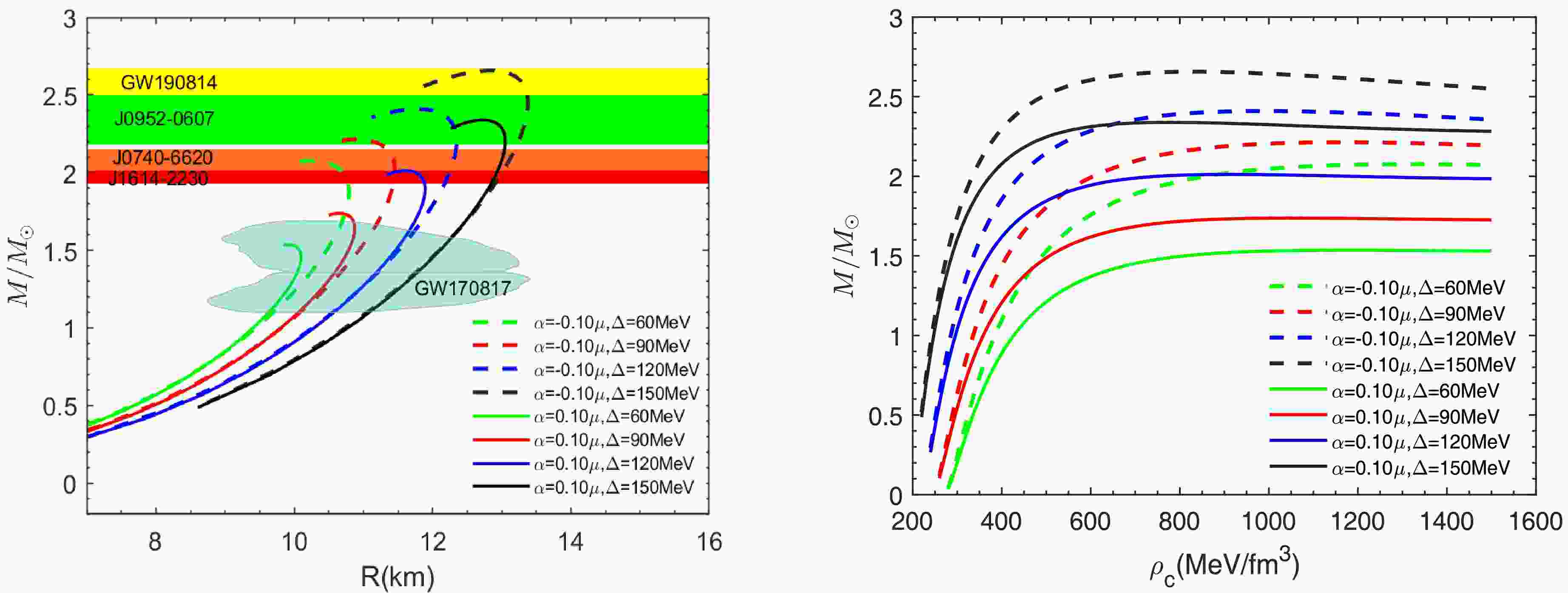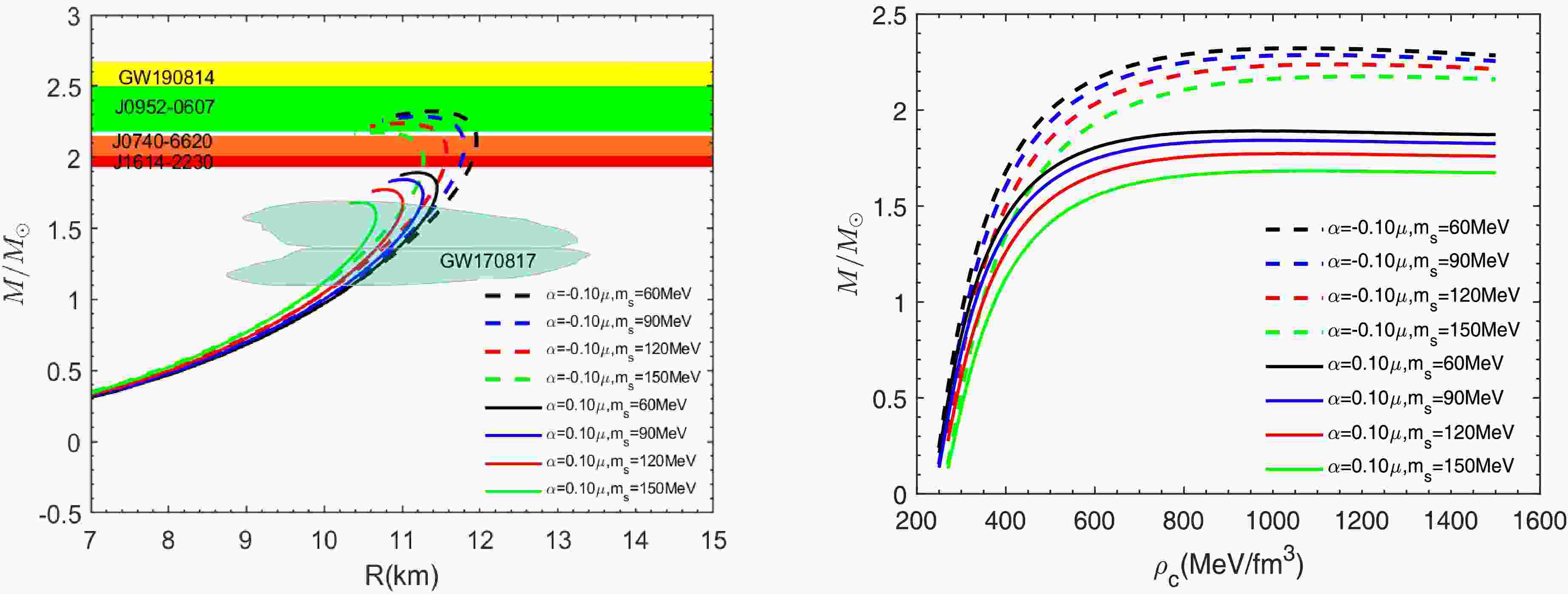 $ M-R $ and$ M-\rho_{c} $ relations of quark stars as Δ varies. The dashed and solid lines correspond to the cases of$ \alpha = -0.1 $ μ and$ \alpha = 0.1 $ μ, respectively, and the other parameters are set to B = 70MeV/fm3 and$ m_{s} $ = 100MeV. Table 2 shows some quantities related to the properties of quark stars. As Δ increases from 60MeV to 120MeV, the maximum mass increases gradually. This is because the decrease in Δ leads to a softening of the equation of state, which reduces the star's ability to support its own gravity. For the case$ \alpha = 0.1 $ μ, the maximum mass ranges from 1.54 to 2.34$ M_{\odot} $ . Remarkably, when$ \alpha = -0.1 $ μ and Δ = 120MeV, the maximum mass increases to 2.65$ M_{\odot} $ , which corresponds to a radius of 12.85km. At this point, the mass-radius curve passes exactly through the contour of GW190814. Therefore, it can also be inferred from the figure that the stiffer equation of state is able to fit the observations of GW190814 after the Δ exceeds 120MeV. We then proceed to study the impact of$ m_{s} $ on the structure of quark stars. Fig. 4 presents the results for α varying within the range$ [-0.8, 1.0] $ , while other parameters are held constant at Δ = 100 MeV and$ B = 70 $ MeV/fm3. From the figure, it is evident that as$ m_{s} $ increases from 100 to 150 MeV, the equation of state softens, leading to a slight decrease in the maximum mass of the quark star. For the case of$ \alpha = 0.1 $ μ, the maximum mass of the quark star is 1.89$ M_{\odot} $ , which is not consistent with observations of massive pulsars. When$ \alpha = -0.1 $ μ, the maximum mass ranges from 2.18 to 2.32$ M_{\odot} $ , with the corresponding radius ranging from 9.82 to 12.21 km, as shown in Table 3.α(μ) $ m_{s} $ (MeV)
