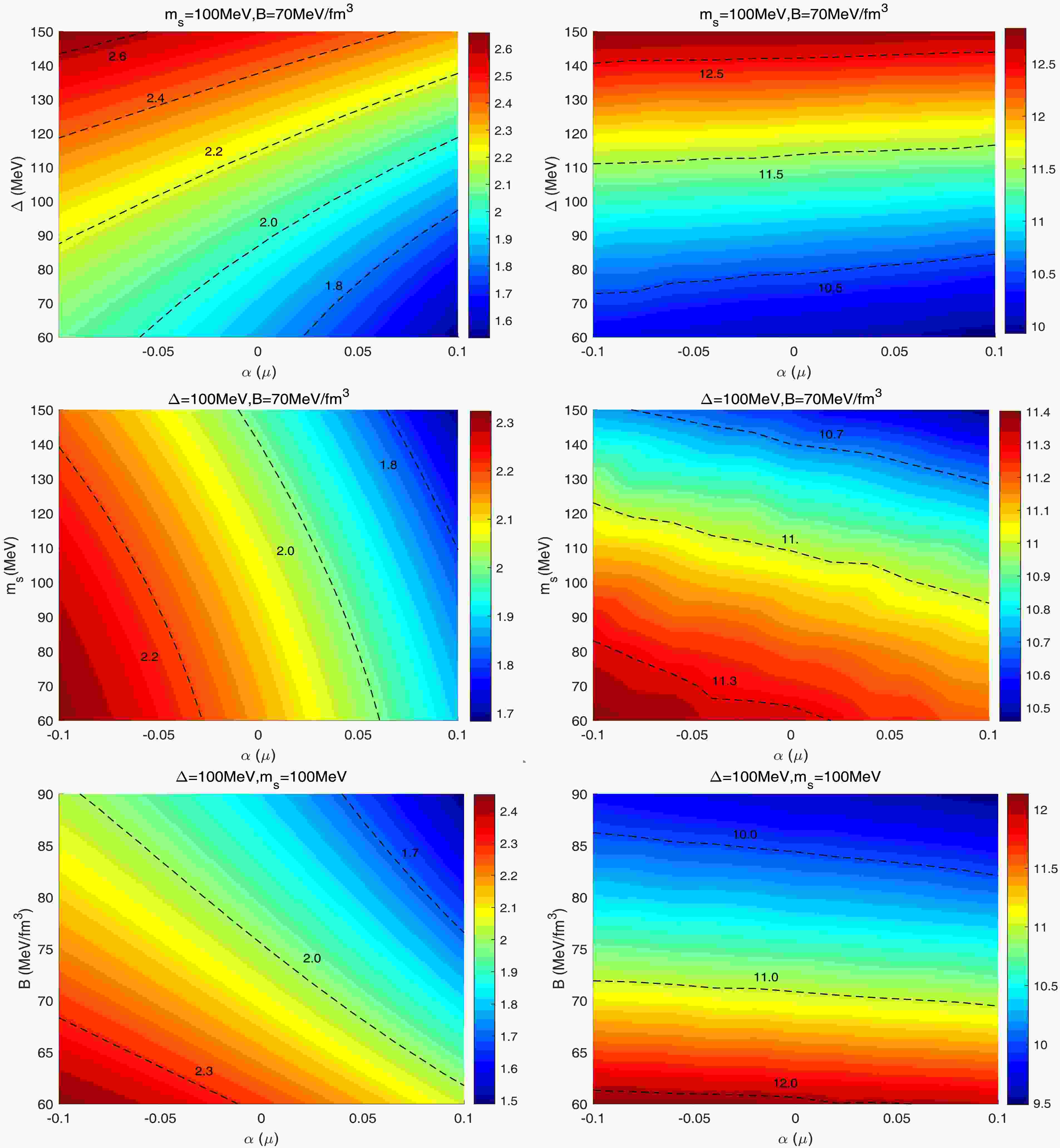 $ 60-90 $ MeV/fm3, on the mass-radius relation of quark stars. The other parameters are set as$ m_{s} $ = 150MeV and Δ = 100MeV. The results show that as the value of B decreases, both the maximum mass and radius of the quark star increase significantly. For the case of$ \alpha = 0.1 $ μ, the maximum mass ranges from 1.49 to 2.04$ M_{\odot} $ , with the corresponding radius ranging from 9.48 to 11.96, as shown in Table 4. When$ \alpha = -0.1 $ μ, the mass-radius curve passes exactly through the contour lines of the data except for GW190814. The shaded regions in Figs. 2-5 represent the mass-radius constraints from the gravitational wave event GW170817, indicating that the compact star models generated by the above parameters all satisfy these constraints. Furthermore, Fig. 6 shows contour plots of the maximum mass and the corresponding radius across the entire range of parameter values, with the 2.00$ M_{\odot} $ contour explicitly marked. Parameter combinations above this contour are compatible with both the observed massive pulsars and the mass-radius constraints inferred from gravitational wave events GW170817.α(μ) B(MeV/fm3) $ M_{max} $