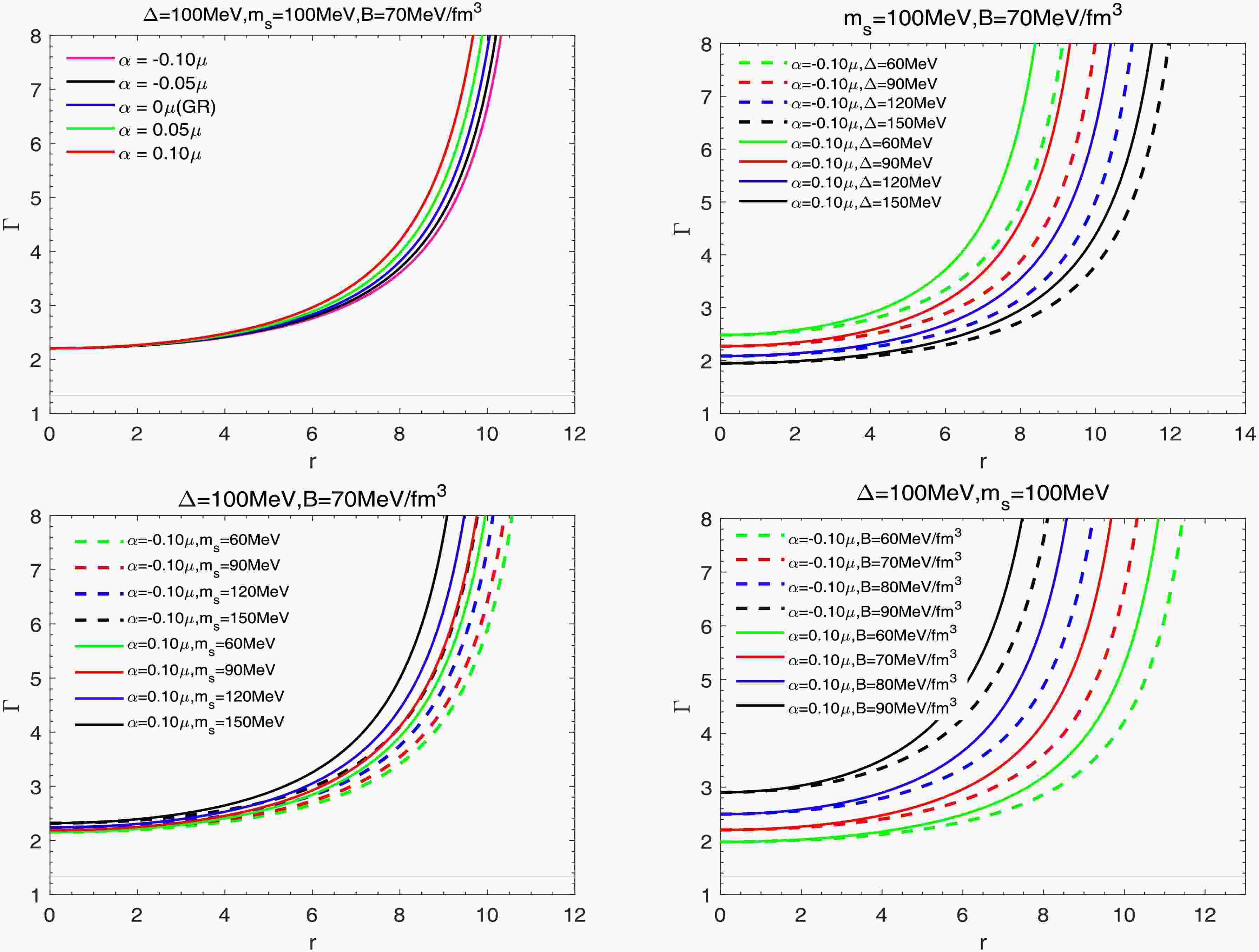 $ \Gamma=4/3 $ . The behavior of the adiabatic index as a function of radius is discussed, and as shown in Fig. 8, the adiabatic index satisfies$ \Gamma > 4/3 $ for different values of the parameters. This indicates that the model constructed under$ f(R,L_{m},T) $ gravity framework is stable against radial adiabatic infinitesimal perturbations. -