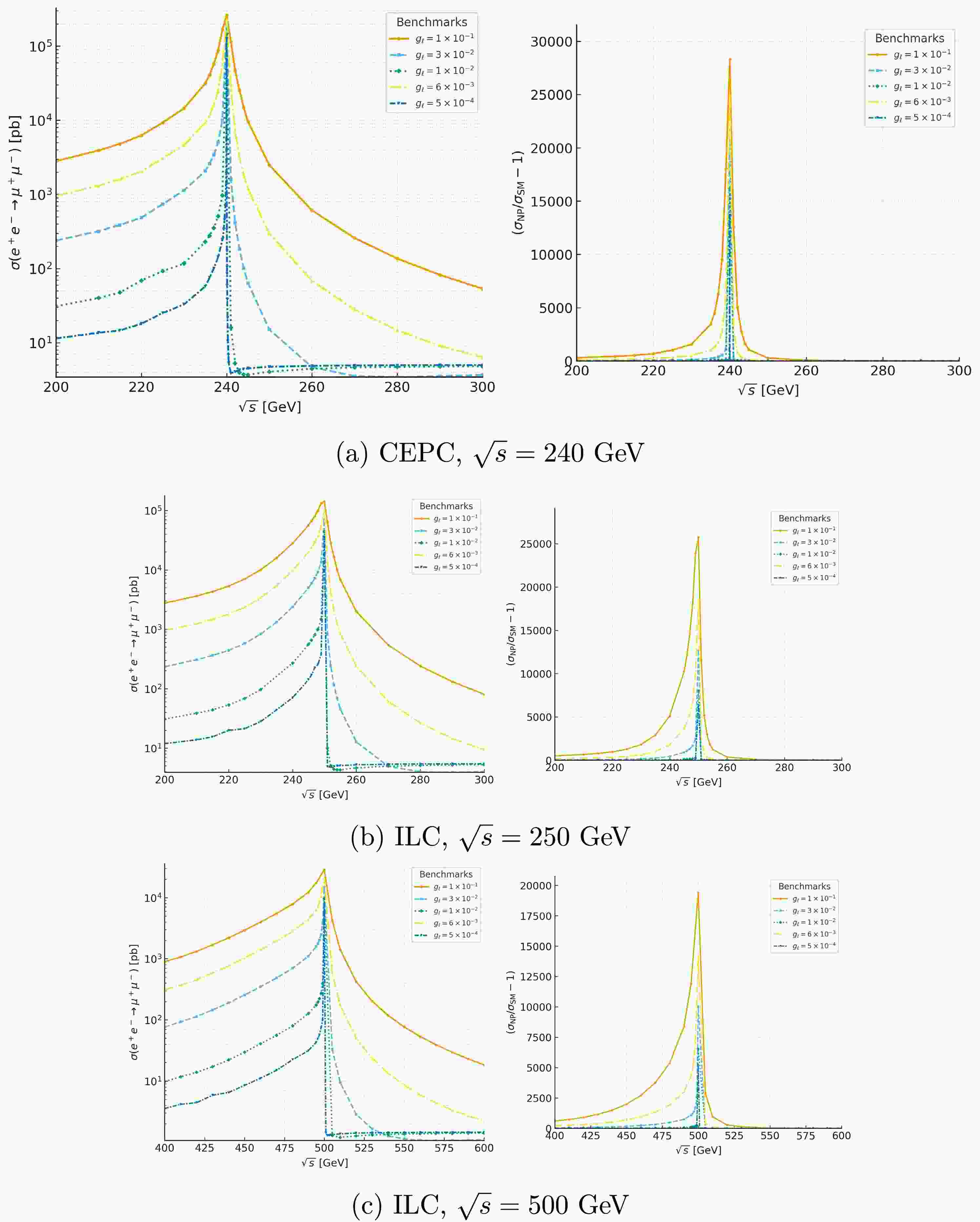 $ \sigma(e^+e^- \to\mu^+\mu^-) $ and its relative deviation$ (\sigma_{\rm NP}/\sigma_{\rm SM}-1) $ as functions of$ M_{Z_\ell} $ for representative couplings$ g_\ell $ . (a) CEPC at$ \sqrt{s}=240\; \text{GeV} $ with$ 20\; \text{ab}^{-1} $ integrated luminosity (TDR baseline). (b) ILC at$ \sqrt{s}=250\; \text{GeV} $ with$ 2\; \text{ab}^{-1} $ polarized beams. (c) ILC at$ \sqrt{s}=500\; \text{GeV} $ , where higher energies extend the sensitivity to heavier$ Z_\ell $ states. Right-hand panels show the fractional deviation from the SM prediction, highlighting the discovery potential even for small couplings.The dependence of the total cross section on the center-of-mass energy is illustrated in Fig. 4. The CEPC projection (Fig. 4a) shows excellent sensitivity near
