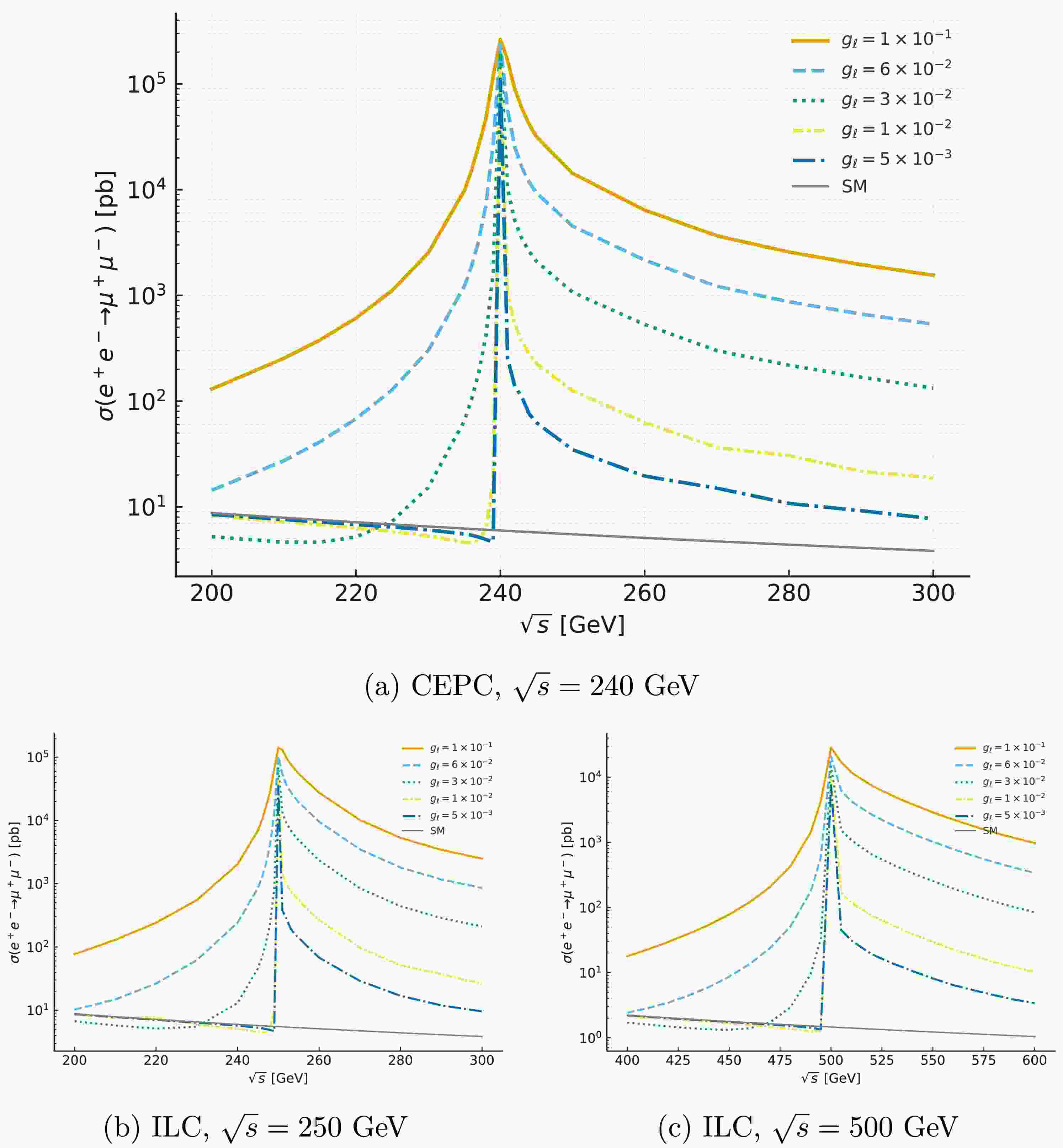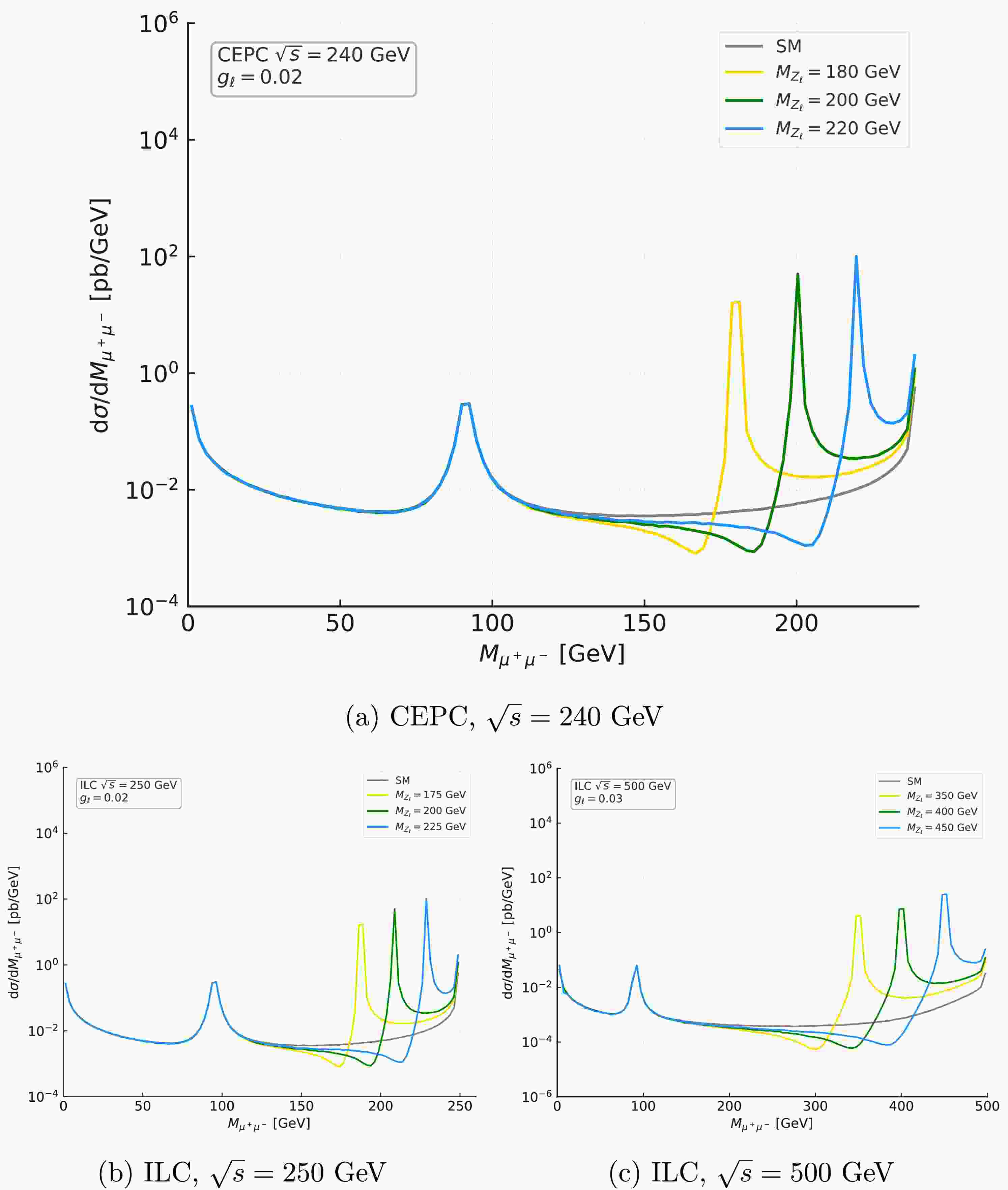 $ Z_\ell $ masses. At the CEPC ($ \sqrt{s}=240\; {\rm{GeV}} $ , Fig. 7a), narrow peaks emerge around 180–220 GeV for$ g_\ell=0.02 $ , clearly separated from the smooth Standard-Model background. The ILC-250 configuration ($ \sqrt{s}=250\; {\rm{GeV}} $ , Fig. 7b) exhibits similar features near 200 GeV, while the ILC-500 setup ($ \sqrt{s}=500\; {\rm{GeV}} $ , Fig. 7c) with$ g_\ell=0.03 $ demonstrates sensitivity to heavier resonances up to about 450 GeV. These distributions highlight the excellent mass resolution and discovery reach achievable at future$ e^+e^- $ colliders, with visible$ Z_\ell $ peaks even for moderate couplings.