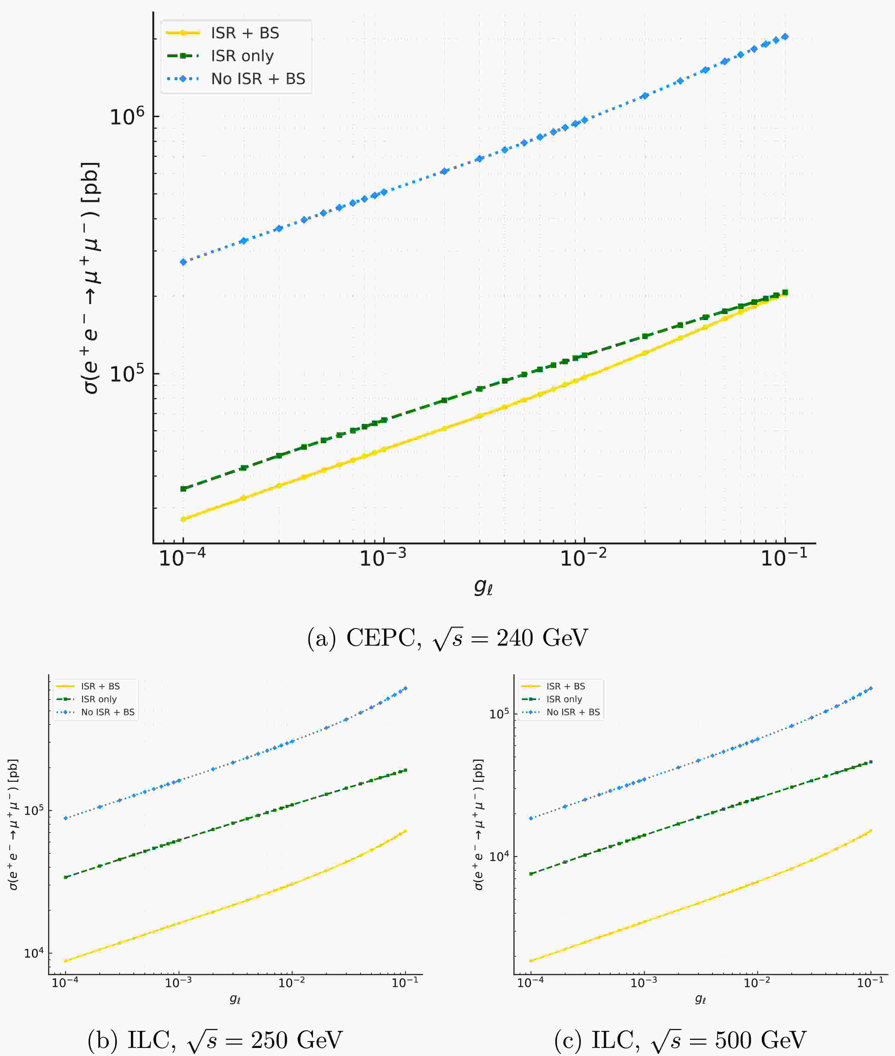 $ g_\ell $ is displayed in Fig. 5. For each collider setup, three configurations are compared: the idealized case without ISR/BS, the ISR–only case, and the full ISR+BS simulation. At the CEPC ($ \sqrt{s}=240\; {\rm{GeV}} $ ), beamstrahlung has only a mild effect, while ISR dominates the suppression of the effective cross section. For the ILC, both the 250 and 500 GeV options (Figs. 5b and 5c) exhibit a stronger sensitivity to ISR+BS, particularly at larger$ g_\ell $ values. These comparisons clearly demonstrate the necessity of including realistic beam effects when estimating discovery sensitivities at future$ e^+e^- $ colliders.