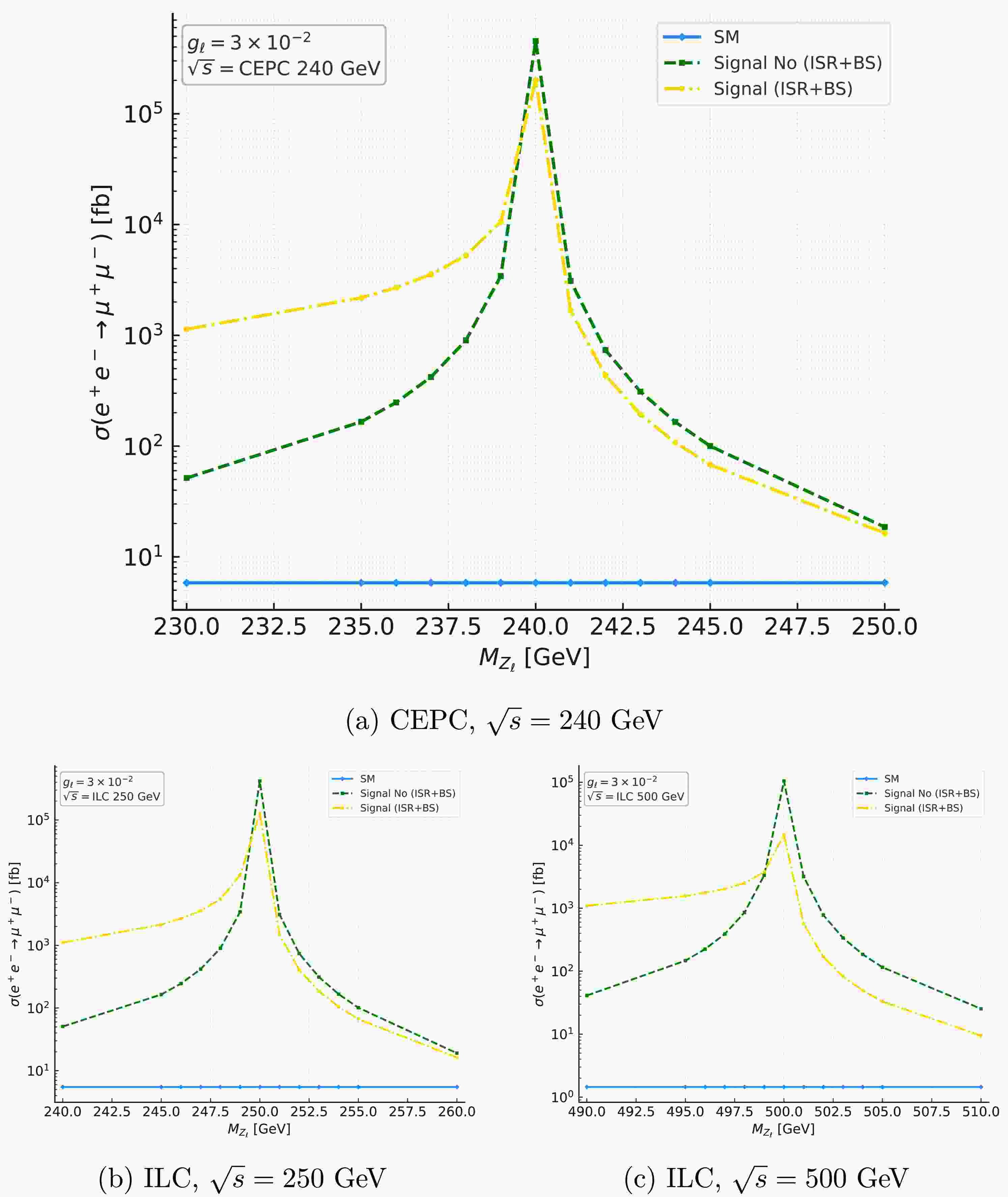 $ M_{Z_\ell} $ for$ g_\ell=3\times10^{-2} $ . At CEPC (Fig. 6a) the resonance appears as a narrow peak, while at ILC-250 (Fig. 6b) it is moderately broadened, and at ILC-500 (Fig. 6c) the peak becomes significantly wider due to stronger beam effects. In all cases, however, the deviation from the SM background remains visible, showing that ISR and beamstrahlung reduce but do not eliminate the discovery potential [36, 37].