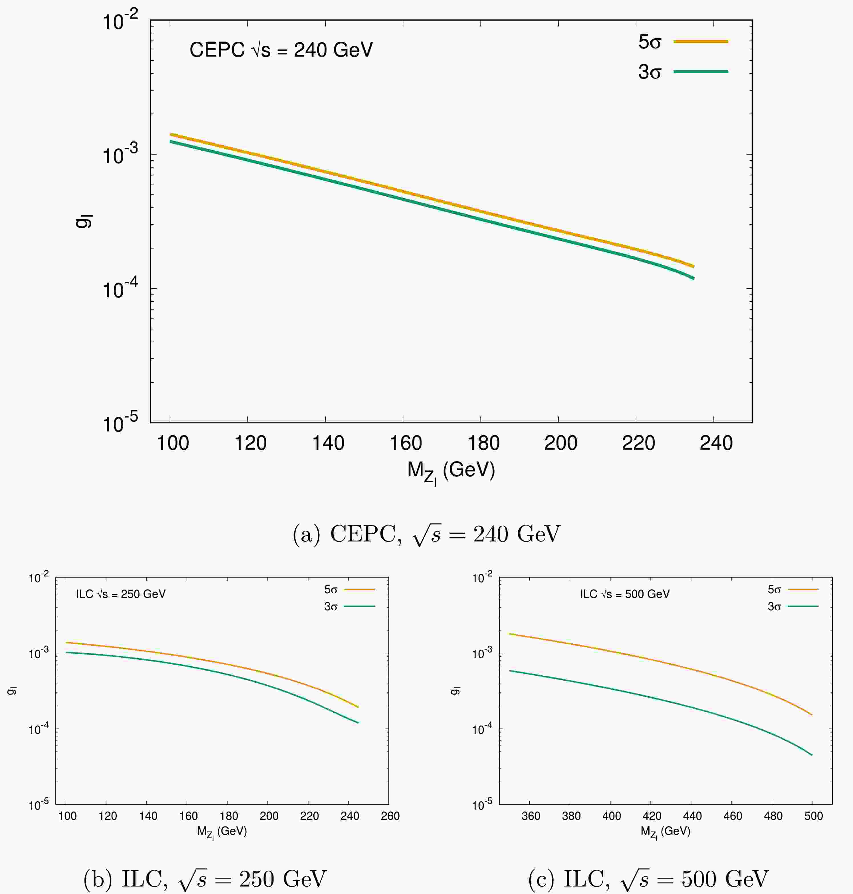$ \sqrt{s}=240 $ GeV due to its very high luminosity, while the ILC panels (Figs. 4b and 4c) extend the reach to higher energies. In particular, the 500 GeV configuration enhances the prospects for discovering a heavy$ Z_\ell $ by probing deviations from the Standard Model spectrum well into the TeV scale.