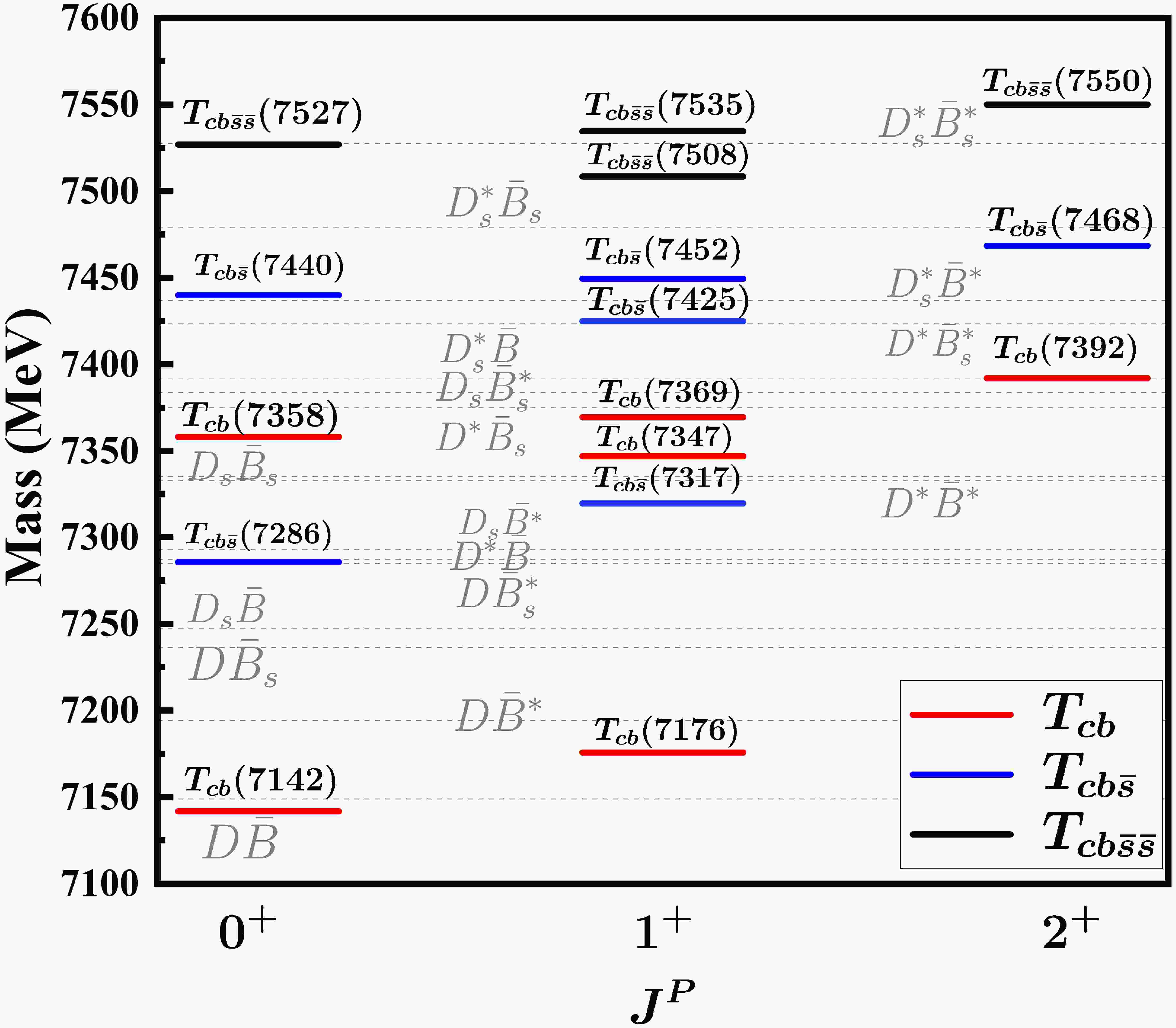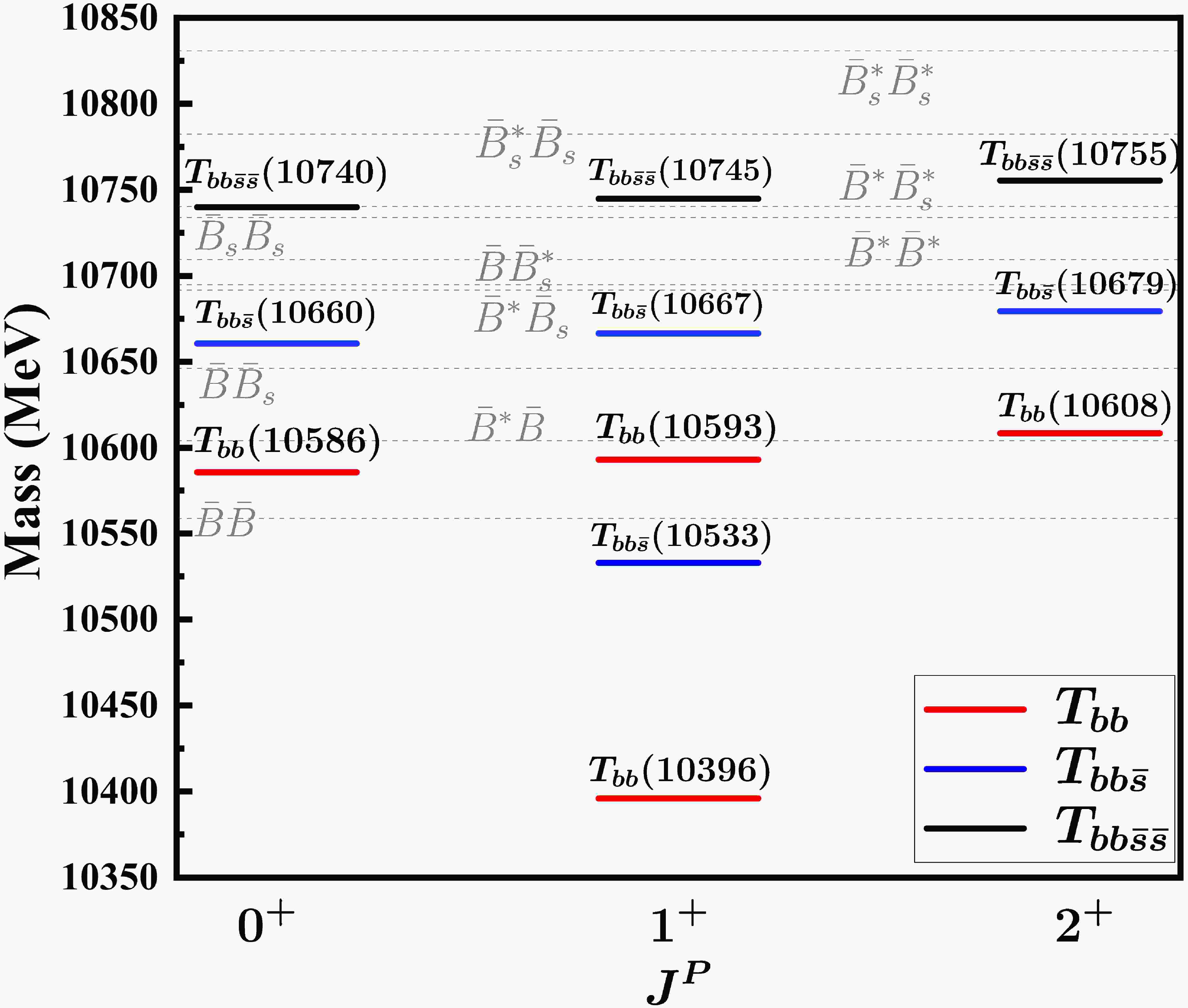 $ T_{cc\bar{q}\bar{q}'} $ ) spectrum, there are 11 particles in total, consisting of 3$ T_{cc\bar{s}\bar{s}} $ states, 4$ T_{cc\bar{s}} $ states and 5$ T_{cc} $ states. Notably, the$ T_{cc}(3876) $ state with$ J^P=1^+ $ aligns closely with the experimentally observed$ T_{cc}^+(3875) $ , positioned near the$ D^{*+}D^0 $ threshold. The$ T_{cc\bar{s}}(4014) $ mass is above the$ DD^*_s $ and$ D^*D_s $ thresholds, but below that of the$ D^*D^*_s $ , while other$ T_{cc\bar{q}\bar{q}'} $ states lie above relevant meson-pair thresholds. Fig. 2 shows the mass spectrum of ground doubly bottomed heavy tetraquarks$ T_{bb\bar{q}\bar{q}'} $ . The numbers of$ T_{bb\bar{q}\bar{q}'} $ in Fig. 2 are consistent with that in Fig. 1 because they share the same configurations. However, unlike the ground doubly charmed heavy tetraquarks, there are many states whose masses are below the corresponding meson pair thresholds. All the states in the$ 1^+ $ and$ 2^+ $ configurations are below the corresponding meson pair masses, particularly the$ T_{bb}(10396) $ with$ J^P=1^+ $ which sits$ \sim $ 160 MeV beneath the$ B^*B $ threshold, suggesting exceptional stability. While in the$ 0^+ $ configuration, the$ T_{bb\bar{s}\bar{s}}(10740) $ is slightly higher than$ \bar{B}_s\bar{B}_s $ threshold,$ T_{bb\bar{s}}(10660) $ is higher than$ \bar{B}\bar{B}_s $ , and$ T_{bb}(10586) $ is higher than$ \bar{B}\bar{B} $ , respectively. Fig. 3 shows the bottom-charm$ T_{bc\bar{q}\bar{q}'} $ sector featuring 13 states due to asymmetric spin couplings. Among them, there are 4$ T_{cb\bar{s}\bar{s}} $ states, 6$ T_{cb\bar{s}} $ states, and 6$ T_{cb} $ states. Among the 5 states in$ 0^+ $ configuration,$ T_{cb\bar{s}}(7286) $ is higher than$ D\bar{B}_s $ and$ D_s\bar{B} $ , but much lower than$ D^*_s\bar{B}^* $ and$ D^*\bar{B}^*_s $ ,$ T_{cb}(7142) $ is below the$ D\bar{B} $ threshold, while the remaining states are above the corresponding meson pair thresholds. In the$ 1^+ $ and$ 2^+ $ configuration, most of the$ T_{bc\bar{q}\bar{q}'} $ states are above the corresponding meson-meson thresholds, except the$ T_{cb\bar{s}}(7317) $ , which is above the threshold of$ D\bar{B}^*_s $ but below that of$ D^*\bar{B}_s $ .Common characteristics include the universal mass hierarchy