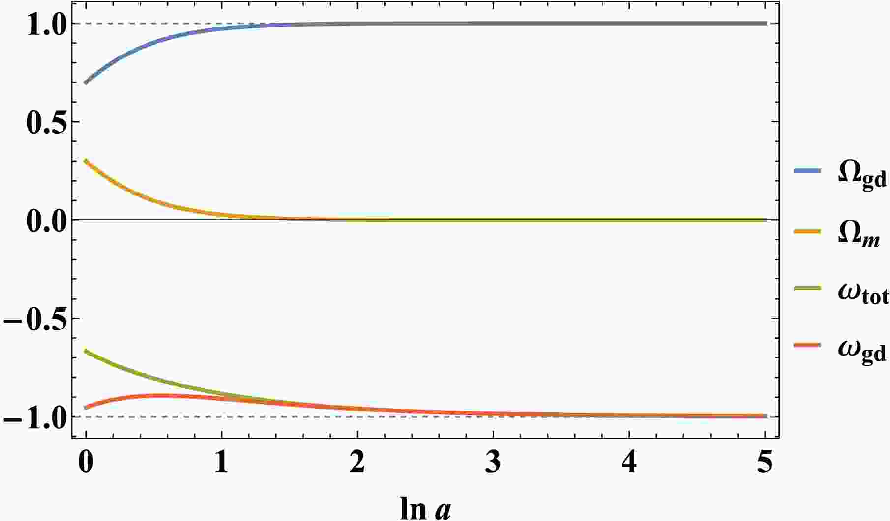 At this fixed point, the cosmological parameters satisfy $ \Omega_m = 0 $ and $ \Omega_{\mathrm{gd}} = 1 $, indicating a universe dominated by geometric dark energy. As a de Sitter point with a scale factor evolving as $ a \sim e^{H_0 t} $, $ P^2_{\mathrm{gd}} $ provides a potential explanation for the current cosmic acceleration within the model, provided it acts as a stable attractor.