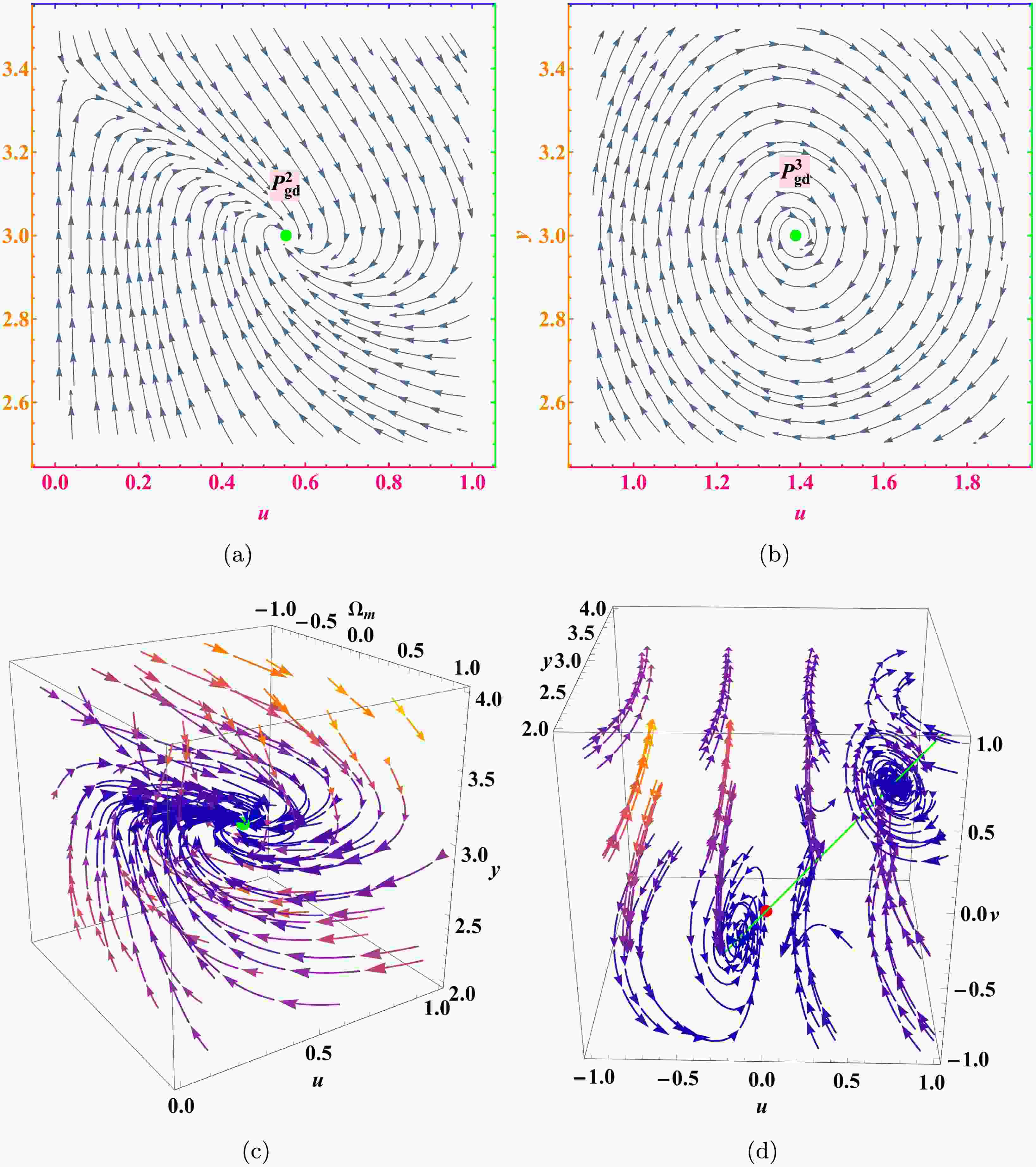 This system possesses two fixed points, denoted as $ P^i_{\mathrm{gd}} $ with coordinates $ (\Omega^i_m, u^i, y^i, v^i) $ for $ i = 2, 3 $.