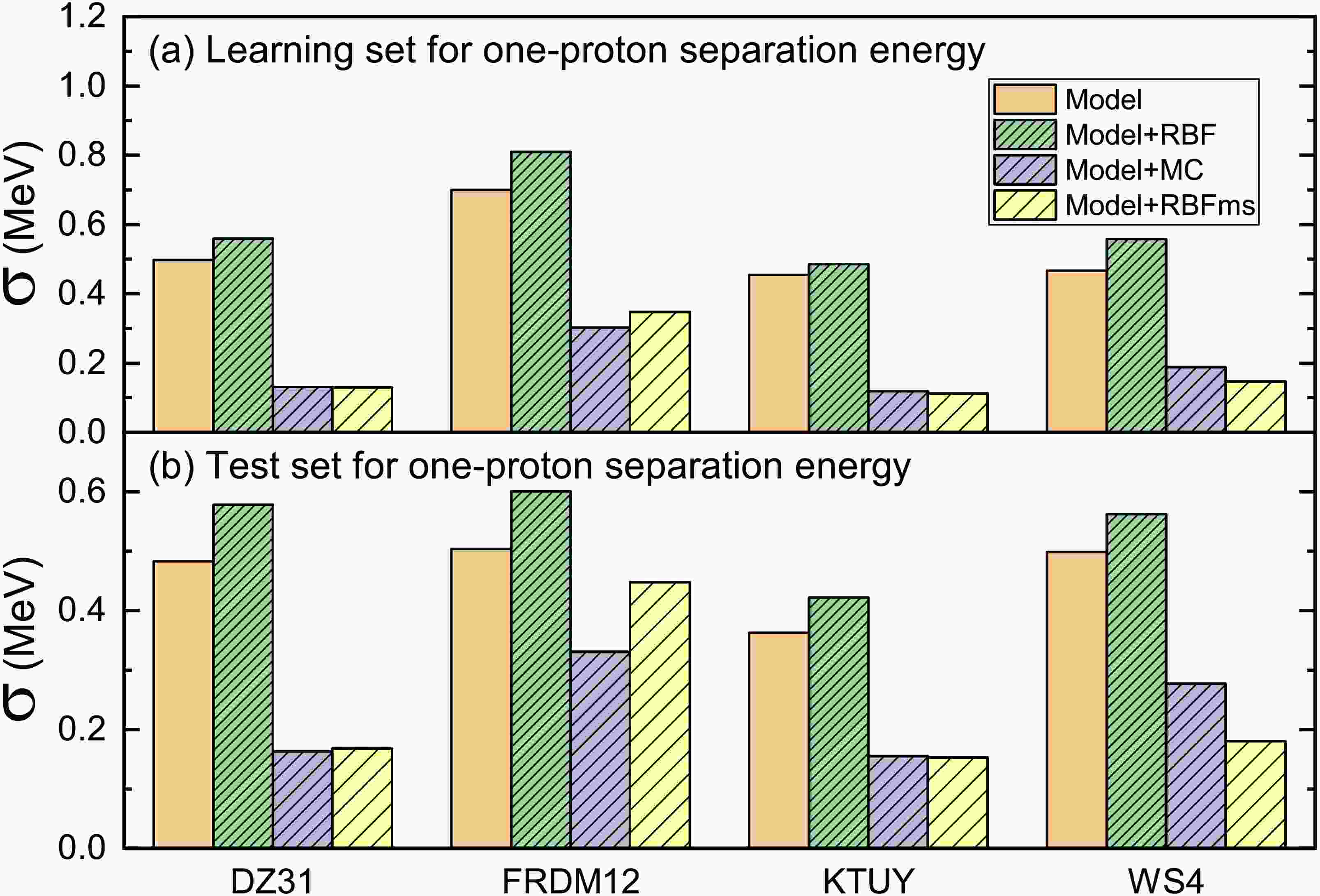 Figure 1. (color online) (a) Root-mean-square (rms) deviation of the learning set for one-proton separation energy obtained using four nuclear mass models (DZ31, FRDM12, KTUY, and WS4) in conjunction with two machine learning approaches (RBF and RBFms) and mirror correction (MC). The unpatterned columns represent the results of the mass models. The dense, medium-dense and sparse patterned columns represent the results of the mass models combine with RBF, RBFms, and MC approaches, respectively. (b) As with (a), but for test set for one-proton separation energy.