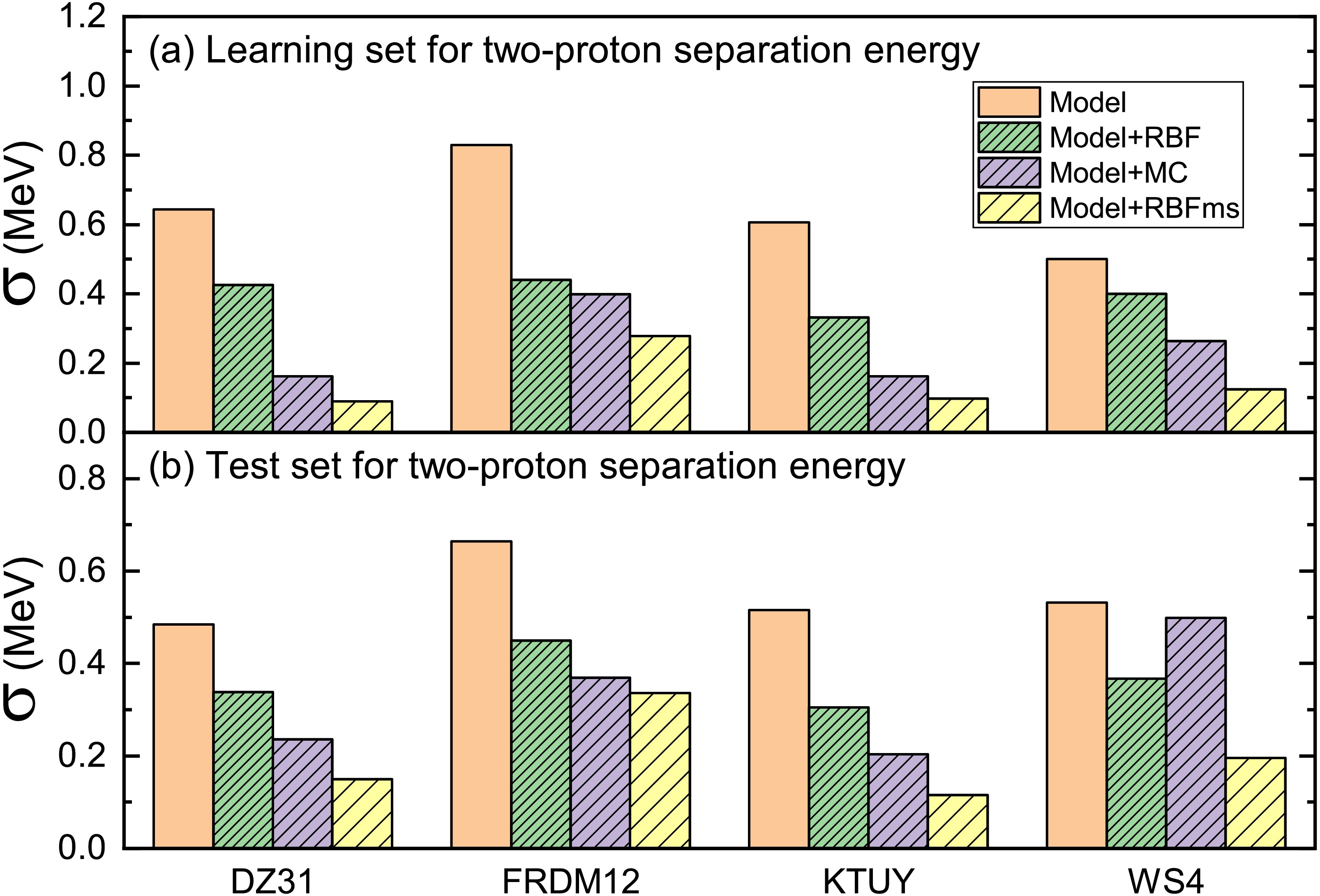 Figure 2. (color online) (a) Root-mean-square (rms) deviation of the learning set for two-proton separation energy obtained using four nuclear mass models (DZ31, FRDM12, KTUY, and WS4) in conjunction with two machine learning approaches (RBF and RBFms) and mirror correction (MC). The unpatterned columns represent the results of the mass models. The dense, medium-dense and sparse patterned columns represent the results of the mass models combine with RBF, RBFms, and MC approaches, respectively. (b) As with (a), but for test set for two-proton separation energy.