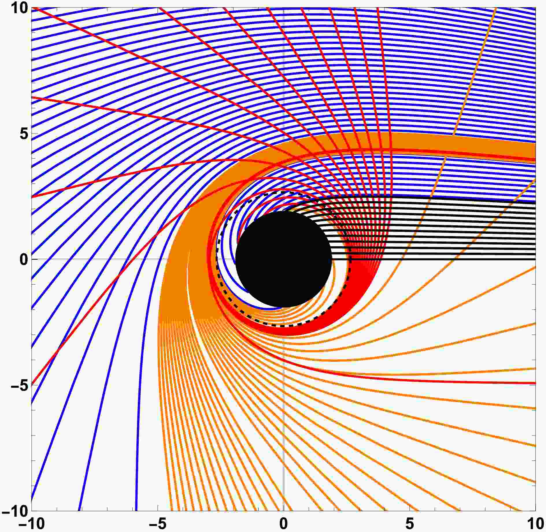Figure 5. (color online) The light rays correspond to shadow (black), direct emission (blue), lensing rings (orange), and photon rings (red). The black disk represents the black hole, and the observer is positioned to its right at a distance of