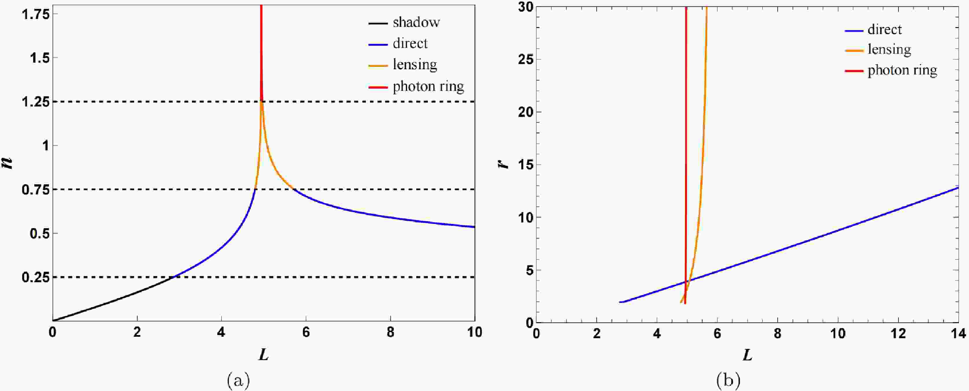 $ r_{o}=50 $ . The initial time for the reverse evolution of light rays at the position of the observer is$ t_{o}=170 $ . We consider an optically and geometrically thin accretion disk, facing directly towards the observer. Due to the dynamical spacetime, we only consider the accretion disk extending to horizon. In this figure, the black light rays directly evolve into the black hole, according to the black hole shadow. It can be observed that the size of black hole shadow depends on the inner edge of the accretion disk. The blue rays cross the equatorial plane at most once, corresponding to direct emission; the orange rays cross the equatorial plane twice, corresponding to lensing rings; the red rays cross the equatorial plane at least three times, corresponding to photon rings[60, 61]. The total number of orbits is defined as$ n=\phi/2\pi $ [60, 61]. Figure 6(a) shows the variation of total number n with angular momentum L. In which black hole shadow satisfies the condition$ n<1/4 $ (black); the direct emission satisfies$ 1/4\leq n<3/4 $ (blue); the lensing ring satisfies$ 3/4\leq n<5/4 $ (orange); the photon ring satisfies$ n\geq5/4 $ (red). Figure 6(b) exhibits the transfer functions$ r_{m}(L) $ for the direct emission, the lensing ring and the photon ring. The blue rays, orange rays and red rays represent the radial coordinate of the first ($ m=1 $ ), second ($ m=2 $ ), and third ($ m=3 $ ) intersections with the thin disk, respectively.