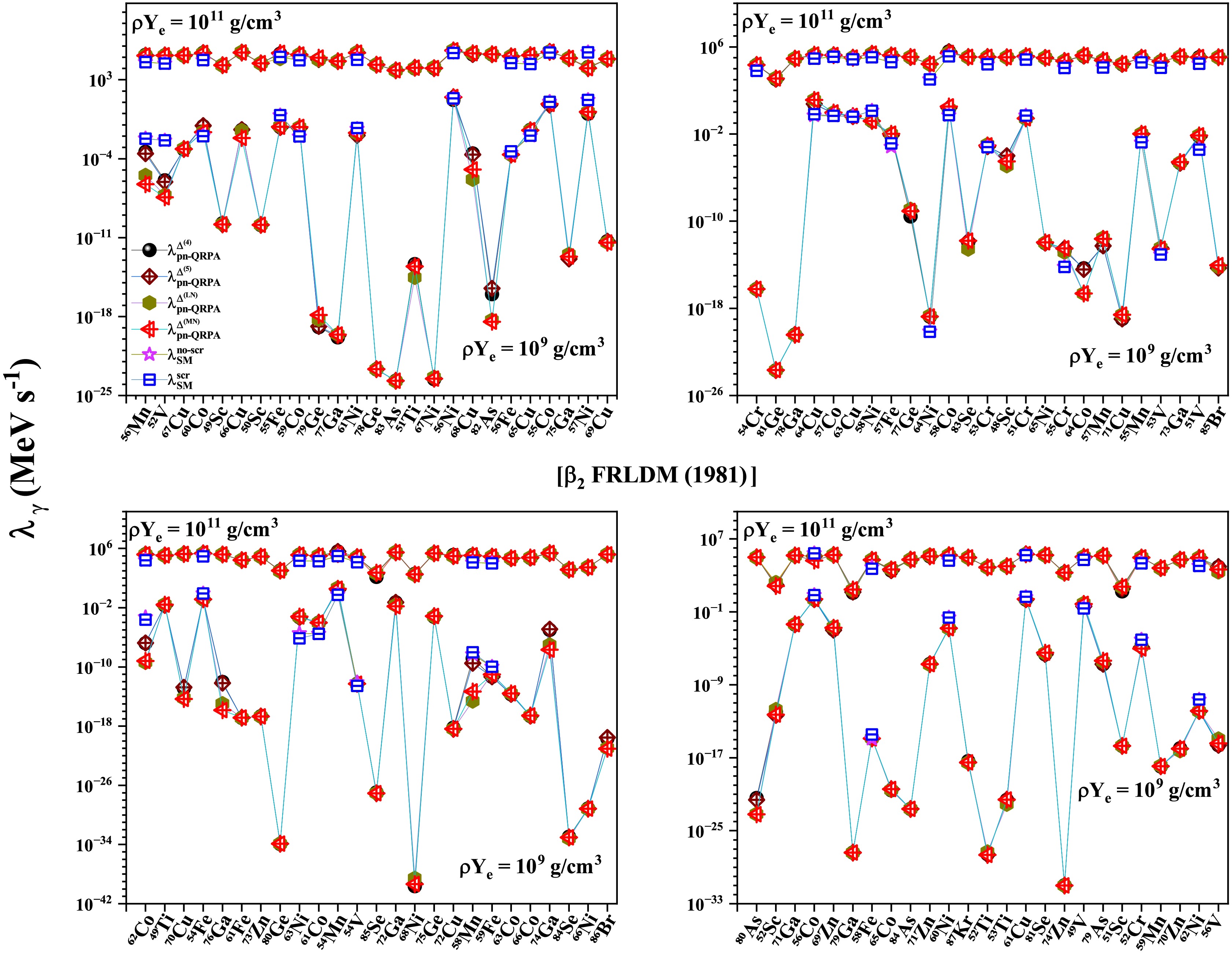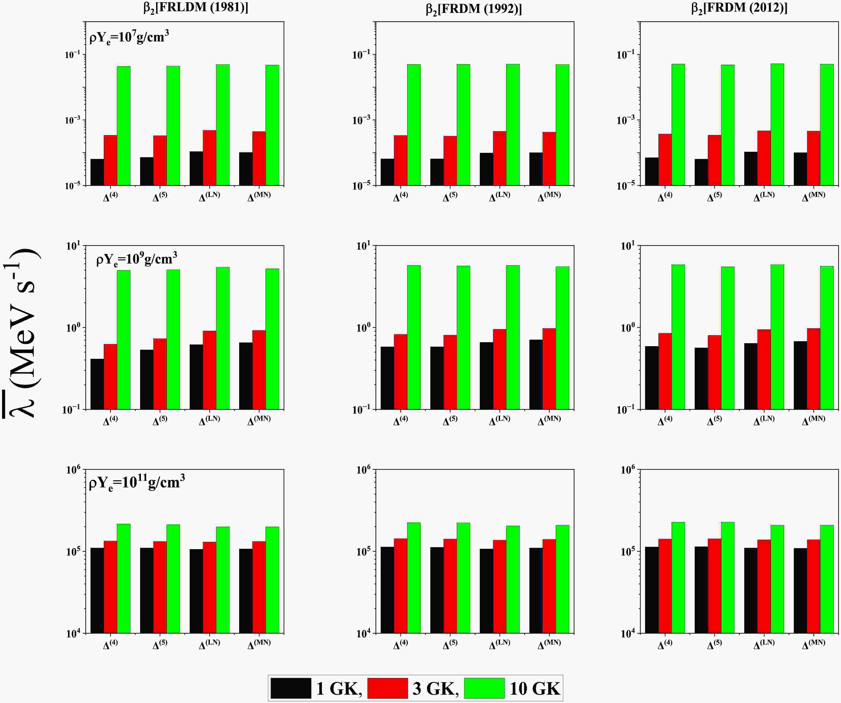 $ T (GK) $ $ \beta_{2} $ [FRLDM (1981)]$ \rho Y_{e} = 10^{9} $ $ g/cm^3 $ $ \rho Y_{e} = 10^{11} $ $ g/cm^3 $ $ \dfrac{\bar{\lambda}^{\Delta^{(4)}}_{pnQRPA}}{\bar{\lambda}^{scr}_{SM}} $ $ \dfrac{\bar{\lambda}^{\Delta^{(5)}}_{pnQRPA}}{\bar{\lambda}^{scr}_{SM}} $ $ \dfrac{\bar{\lambda}^{\Delta^{(LN)}}_{pnQRPA}}{\bar{\lambda}^{scr}_{SM}} $ $ \dfrac{\bar{\lambda}^{\Delta^{(MN)}}_{pnQRPA}}{\bar{\lambda}^{scr}_{SM}} $ $ \dfrac{\bar{\lambda}^{\Delta^{(4)}}_{pnQRPA}}{\bar{\lambda}^{scr}_{SM}} $ $ \dfrac{\bar{\lambda}^{\Delta^{(5)}}_{pnQRPA}}{\bar{\lambda}^{scr}_{SM}} $ $ \dfrac{\bar{\lambda}^{\Delta^{(LN)}}_{pnQRPA}}{\bar{\lambda}^{scr}_{SM}} $ $ \dfrac{\bar{\lambda}^{\Delta^{(MN)}}_{pnQRPA}}{\bar{\lambda}^{scr}_{SM}} $ 1 20.8 20.2 22.1 25.1 4.51 4.44 4.27 4.37 3 6.94 7.17 7.90 7.83 4.69 4.67 4.52 4.65 10 11.6 11.4 11.9 11.3 8.76 8.71 8.41 8.42 $ \beta_{2} $ [FRDM (1992)]1 23.2 22.4 24.1 25.0 4.68 4.69 4.45 4.56 3 6.88 6.92 7.53 7.39 5.37 5.36 5.11 5.24 10 13.8 13.7 12.7 12.9 10.1 10.1 9.33 9.61 $ \beta_{2} $ [FRDM (2012)]1 21.1 20.6 22.5 24.0 4.52 4.47 4.30 4.36 3 7.69 7.73 8.41 8.07 4.88 4.86 4.70 4.78 10 12.4 12.7 12.3 12.1 9.13 9.27 8.64 8.83 Table 2. Comparison of the reported pn-QRPA calculated mean γ -heating rates with shell model rates including screening effects [63].