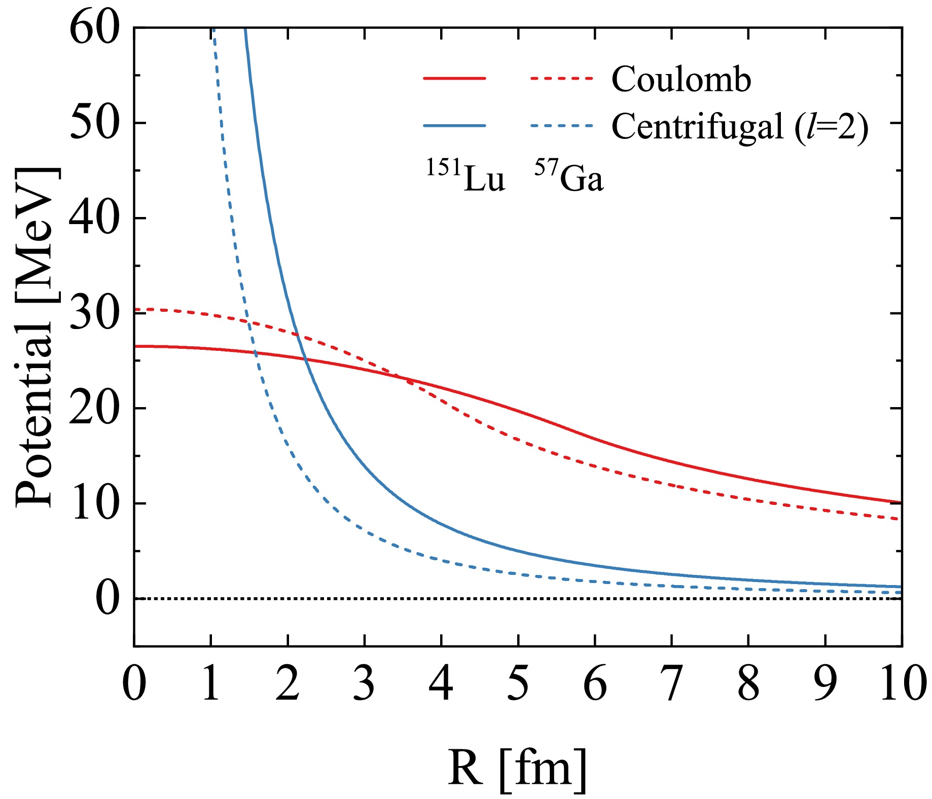 Figure 1. (color online) Sketch of the Coulomb and centrifugal potentials by taking one-proton emitter