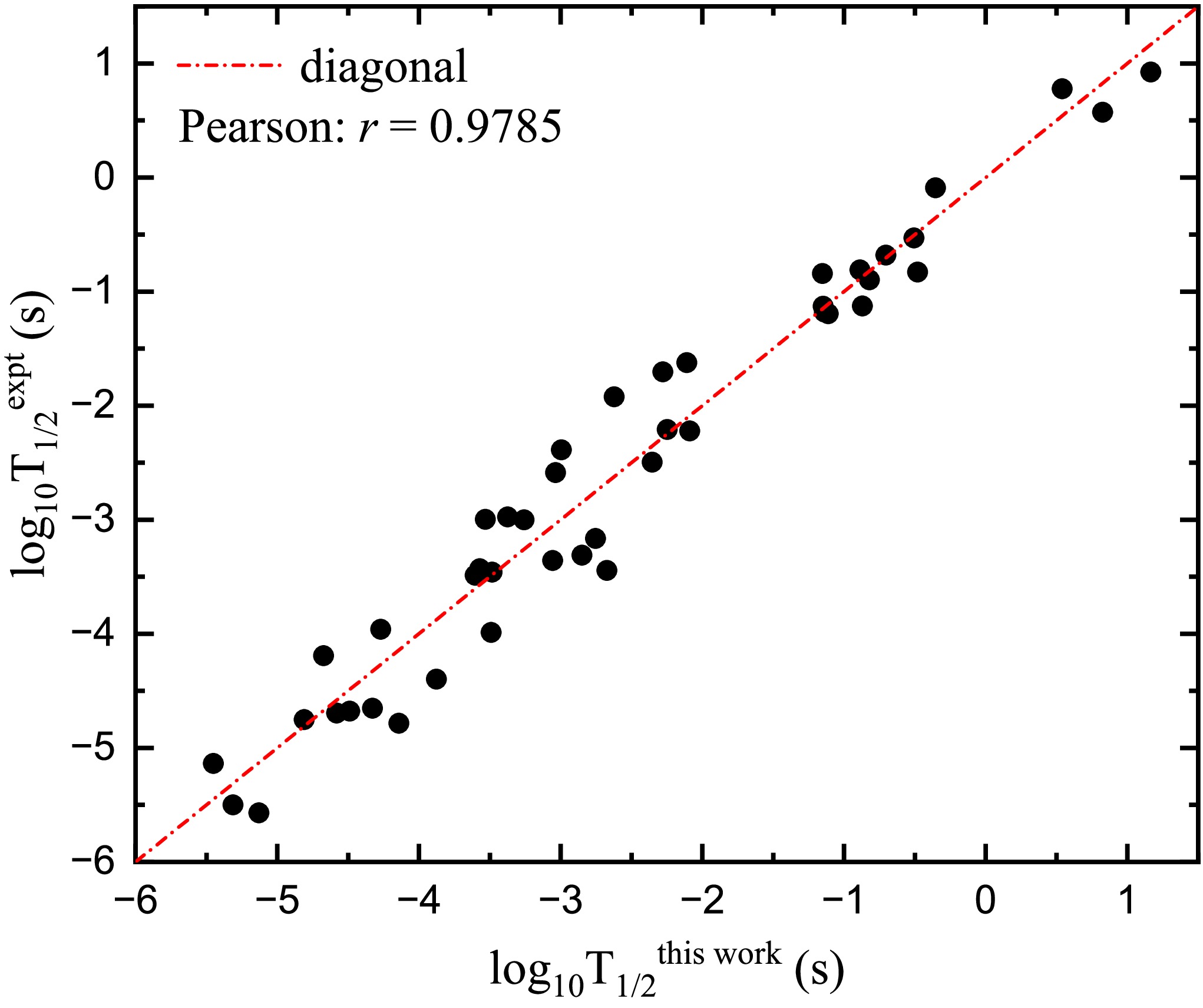 In Fig. 2, we plot the experimental one-proton radioactive half-lives and the calculated ones within the present improved GN law. It can be seen that all the data points cluster closely around the red diagonal line. By calculating the Pearson correlation coefficient with