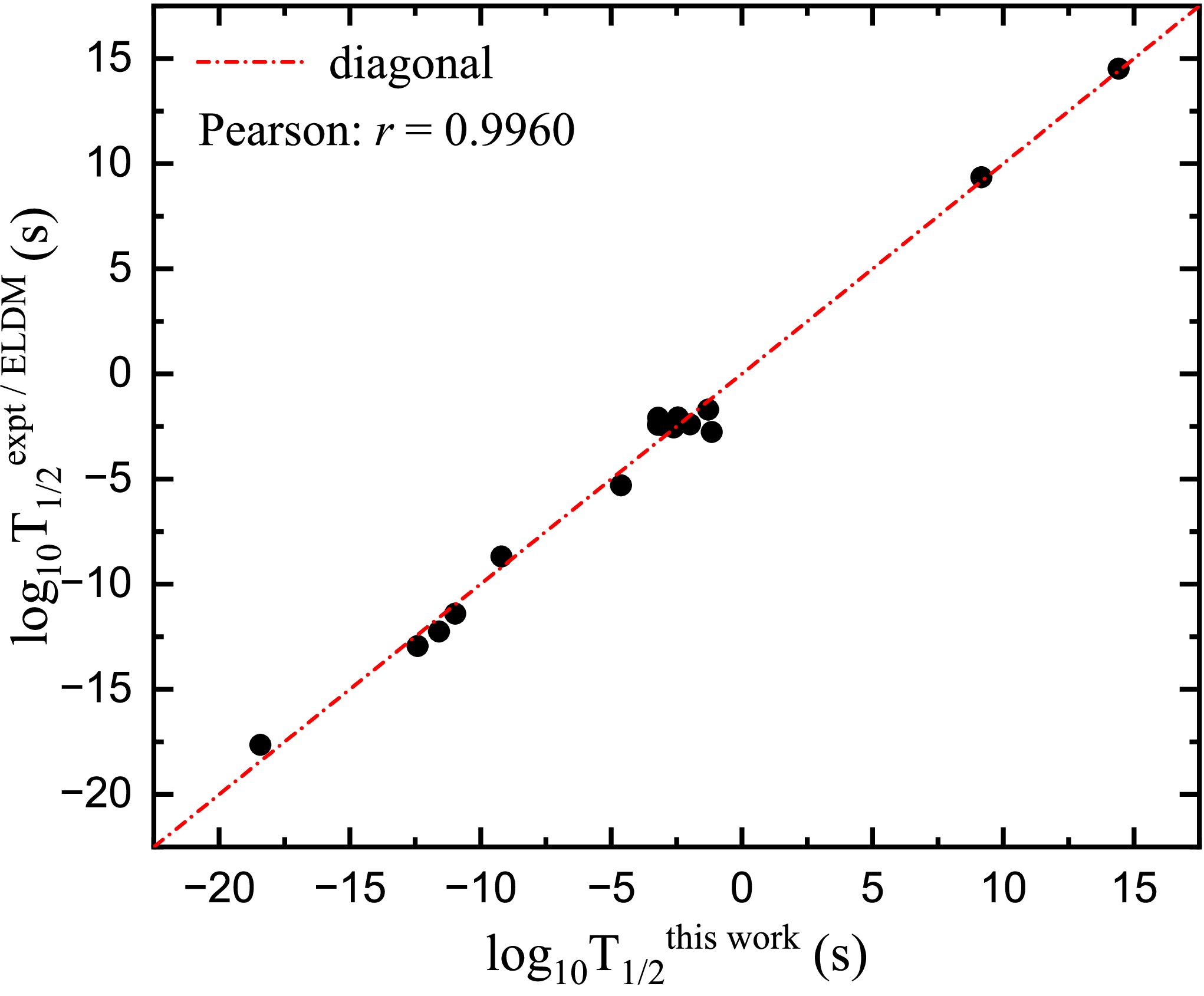 $\log_{10}T_{1/2}^{\text{calc}}$ plotted against$\log_{10}T_{1/2}^{\text{expt/ELDM}}$ for all 17 data points in Fig. 3. The data points generally distribute closely around the diagonal line, and a Pearson correlation coefficient of$r = 0.9960$ is obtained, confirming an excellent linear correlation between the calculated values and the adopted benchmark data set. This strong correlation, together with the relatively small rms deviation$\sigma_{2p}$ , indicates that the present improved GN law provides a reliable and unified description of both true and short-lived light two-proton emitters. In the future, more realistic two-proton emissions with different angular momenta can be used to further promote the accuracy of present improved GN law.