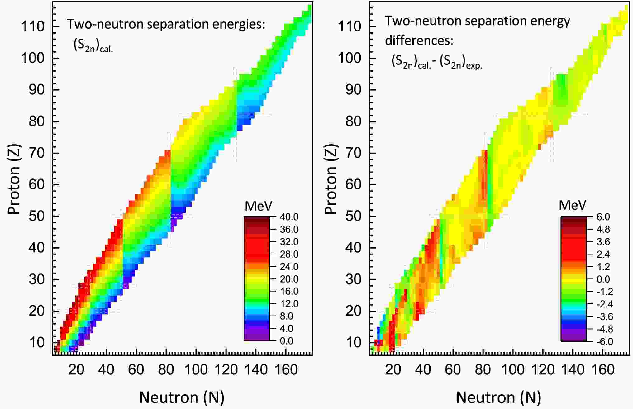 $ S_{2p} $ ) for even-even nuclei, accompanied by the differences between theoretical predictions and experimental measurements. In contrast to the two-neutron separation energy ($ S_{2n} $ ), for a given isotopic chain,$ S_{2p} $ exhibits an increasing trend with neutron number, while in isotonic chains, it demonstrates a decreasing trend with proton number. Furthermore, the data indicate a gradual reduction in$ S_{2p} $ values within neutron-rich regions as the proton number increases. The right panel of Fig. 5 demonstrates that the majority of theoretical-experimental deviations fall within a range of$ \pm2 $ MeV. For the nuclei under investigation, the rms deviation of$ S_{2p} $ between theory and experiment is calculated to be 0.848 MeV, indicating acceptable agreement between theoretical predictions and experimental observations.Figure 5. (color online) Left: Theoretical predictions of two-proton separation energies for even-even nuclei obtained from IQMDD3 calculations. Right: The discrepancy between theoretical calculations and experimental measurements of the two-proton separation energies.