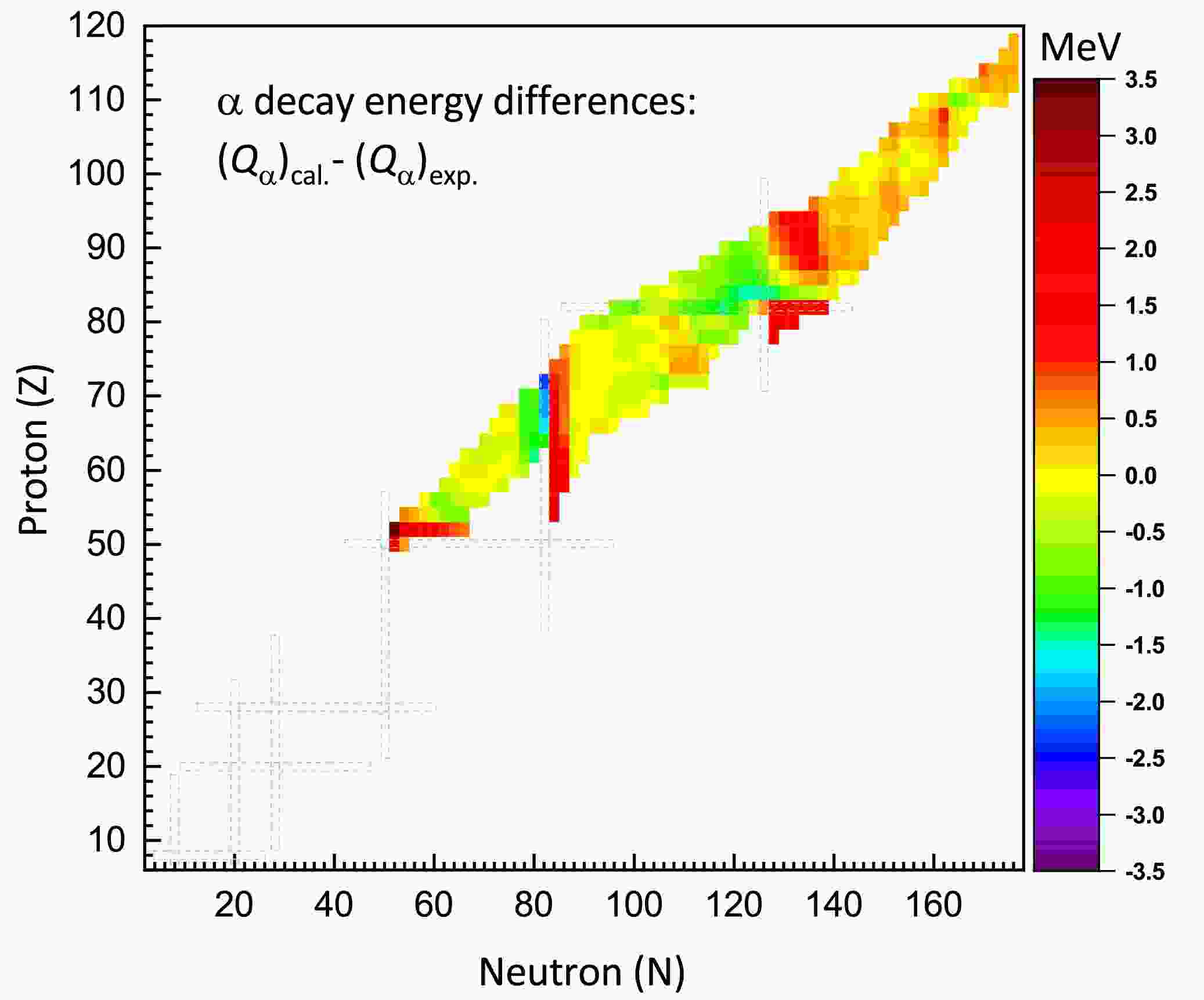 $ Q_{\alpha} $ values calculated using the IQMDD3 model and the experimental data from Ref. [110]. Among the 405 studied even-even nuclei with positive$ Q_{\alpha} $ values, relatively larger deviations are observed in specific nuclei of the Z=52 and Z=94 isotopic chains, as well as in some nuclei along the N=84 isotonic chain. Overall, most of the discrepancies are within$ \pm1.5 $ MeV, and the rms of the discrepancies is 0.733 MeV. Recently, machine learning approaches have been successfully employed in the description of α-decay energies, achieving a remarkably high level of precision [124, 125]. -