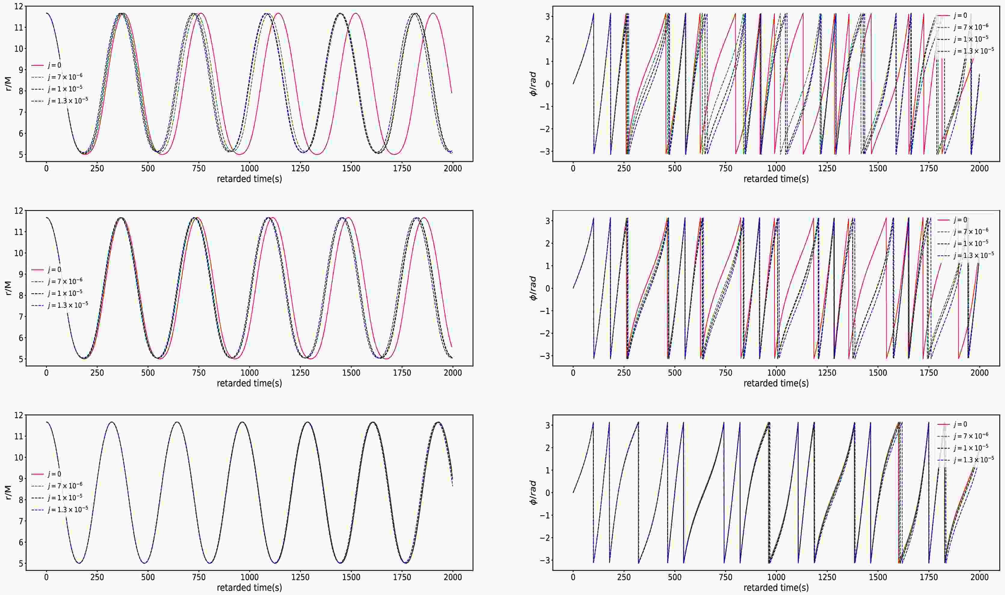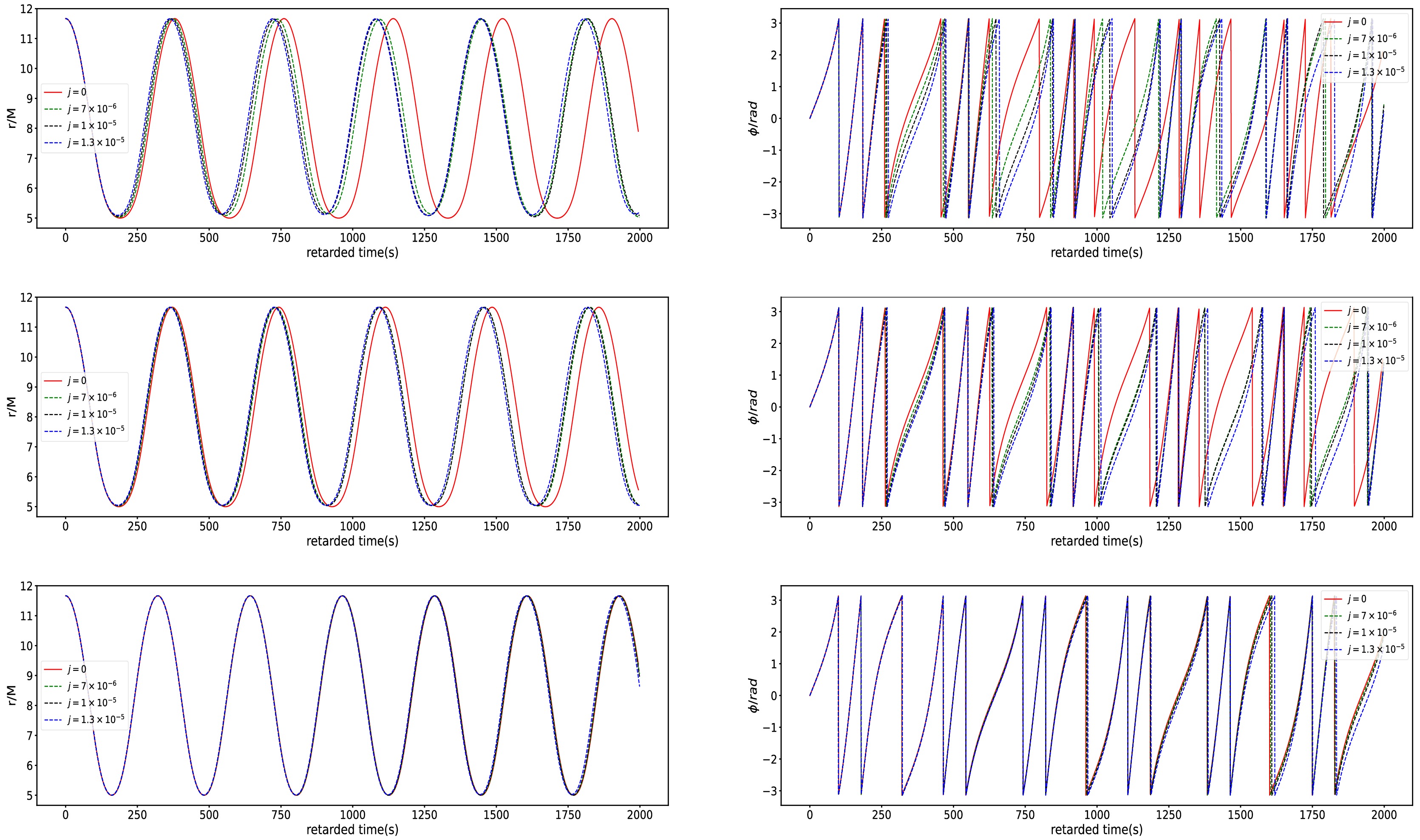 $ e = 0.4 $ and$ p = 7.0M $ in the swirling Kerr spacetime for different j. The left panel and the right panel respectively correspond to the motion in the r-direction and ϕ-directions. The top, middle and bottom rows respectively denote$ a = 0.0 $ ,$ a = 0.01 $ and$ a = 0.1 $ .