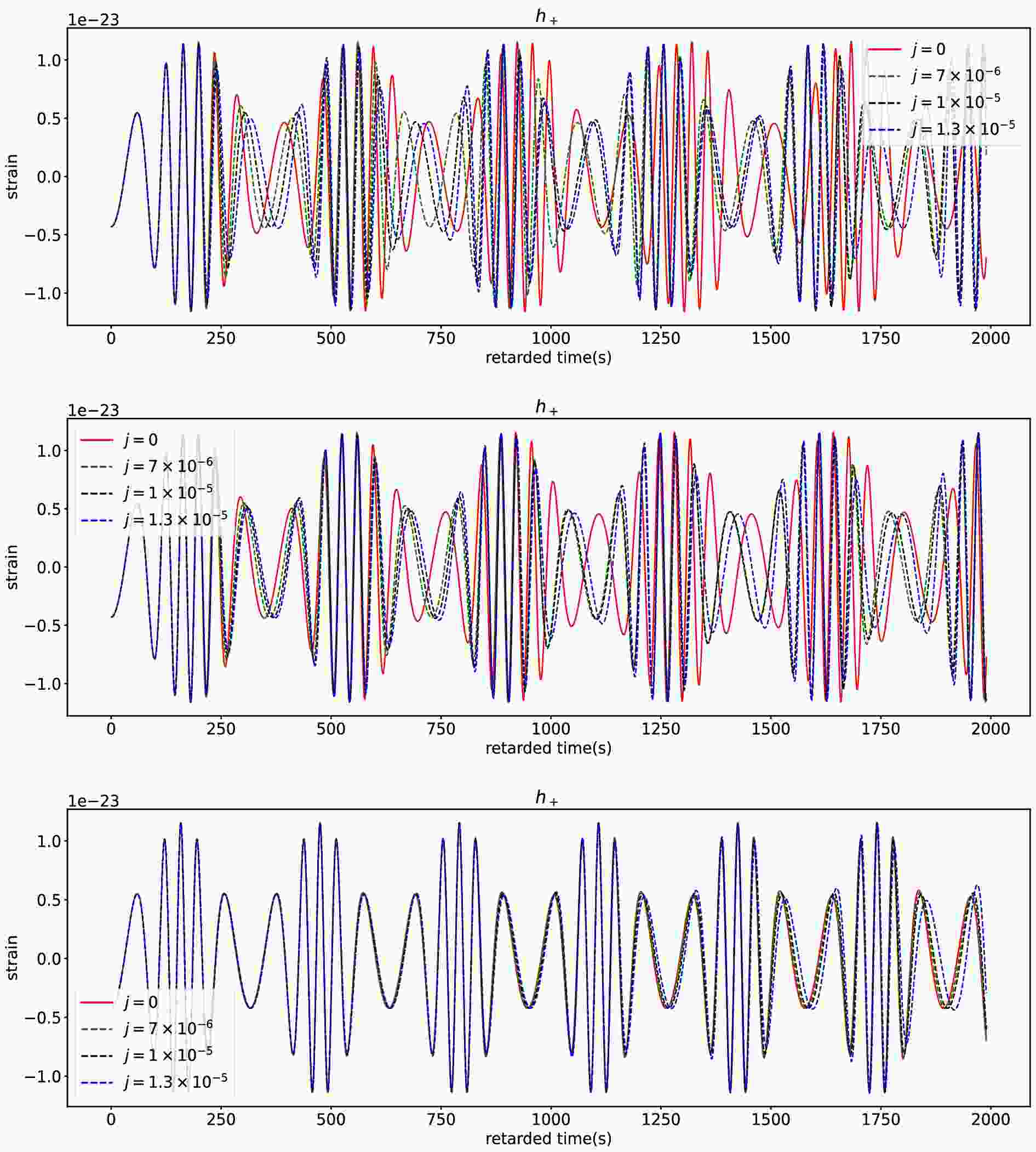 Figure 4. (color online) The plus component of EMRI waveforms for different swirling parameter j. The top, middle and bottom rows respectively correspond to the cases with centre black hole's spin