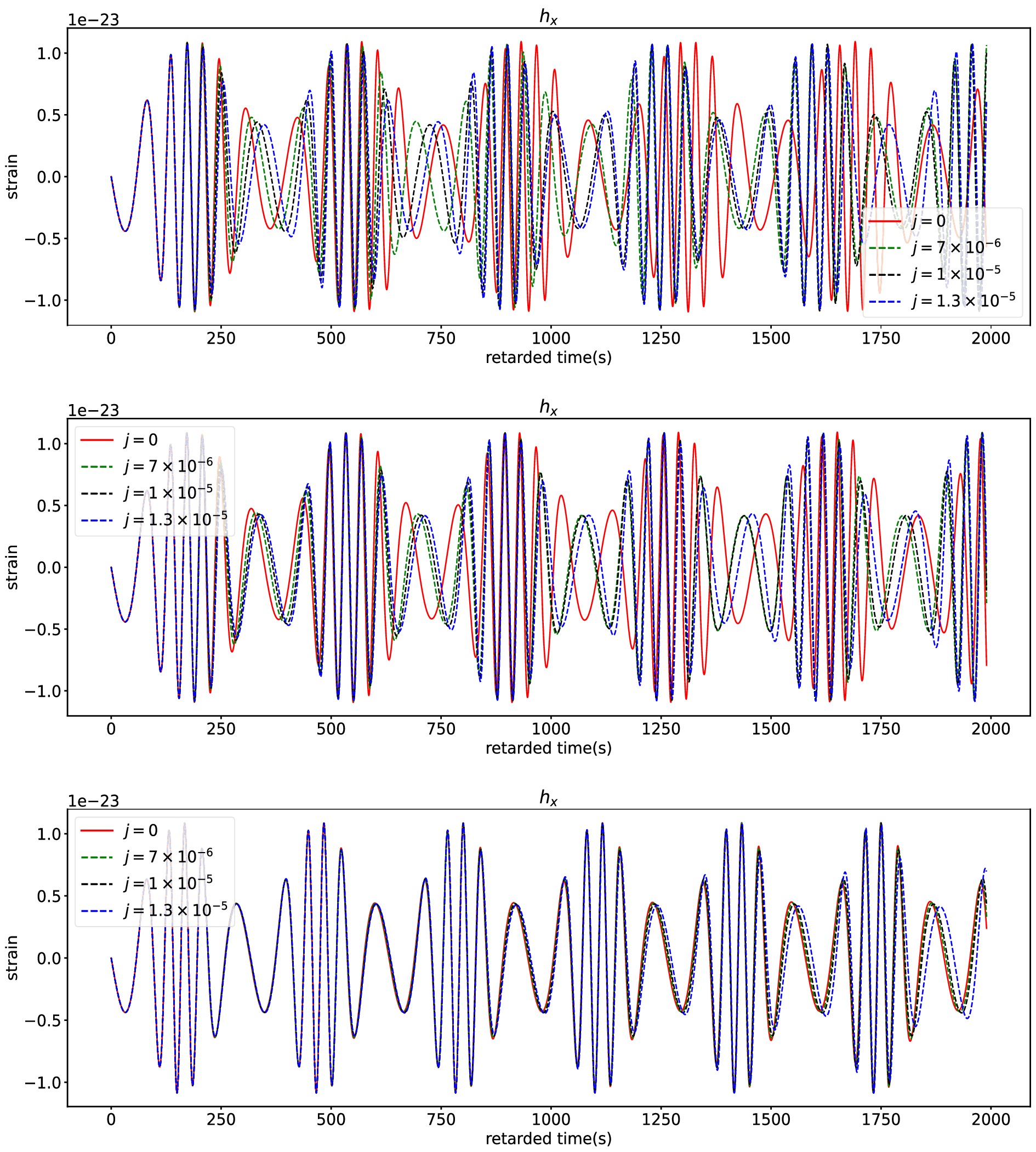 Figure 5. (color online) The cross component of EMRI waveforms for different swirling parameter j. The top, middle and bottom rows respectively correspond to the cases with centre black hole's spin