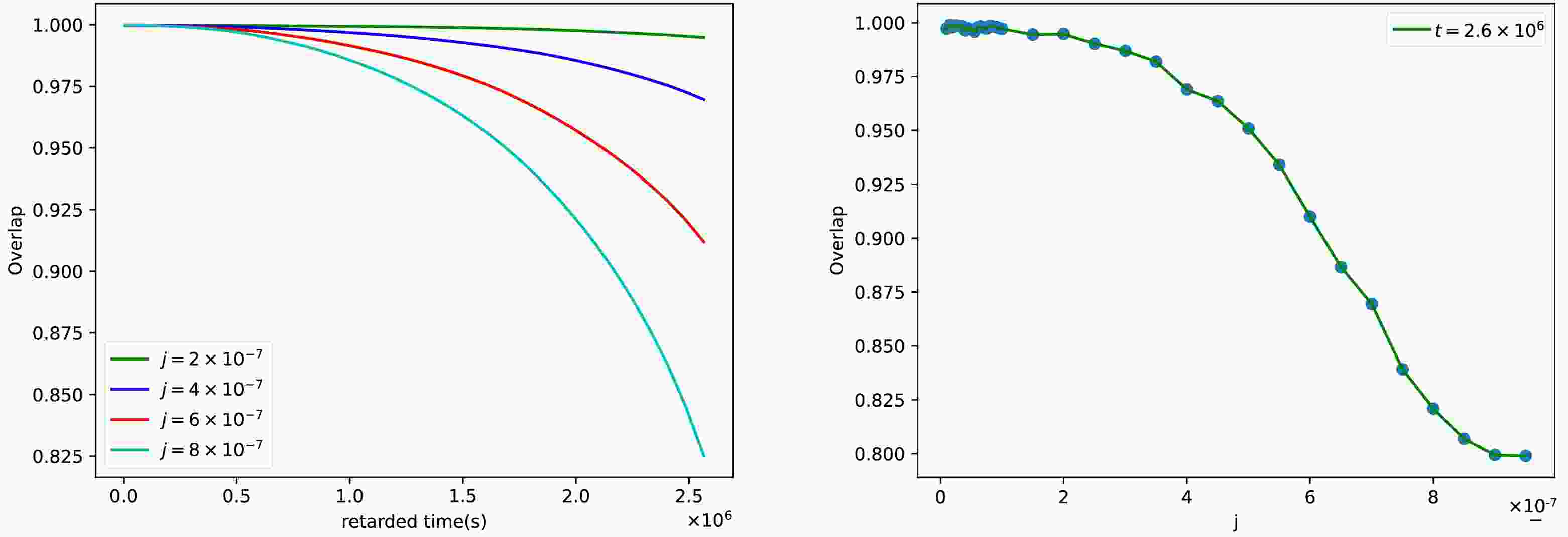 Figure 7. (color online) The overlap between Kerr and swirling-Kerr spacetimes with retarded time t for different j (left) and with j for the fixed signal length