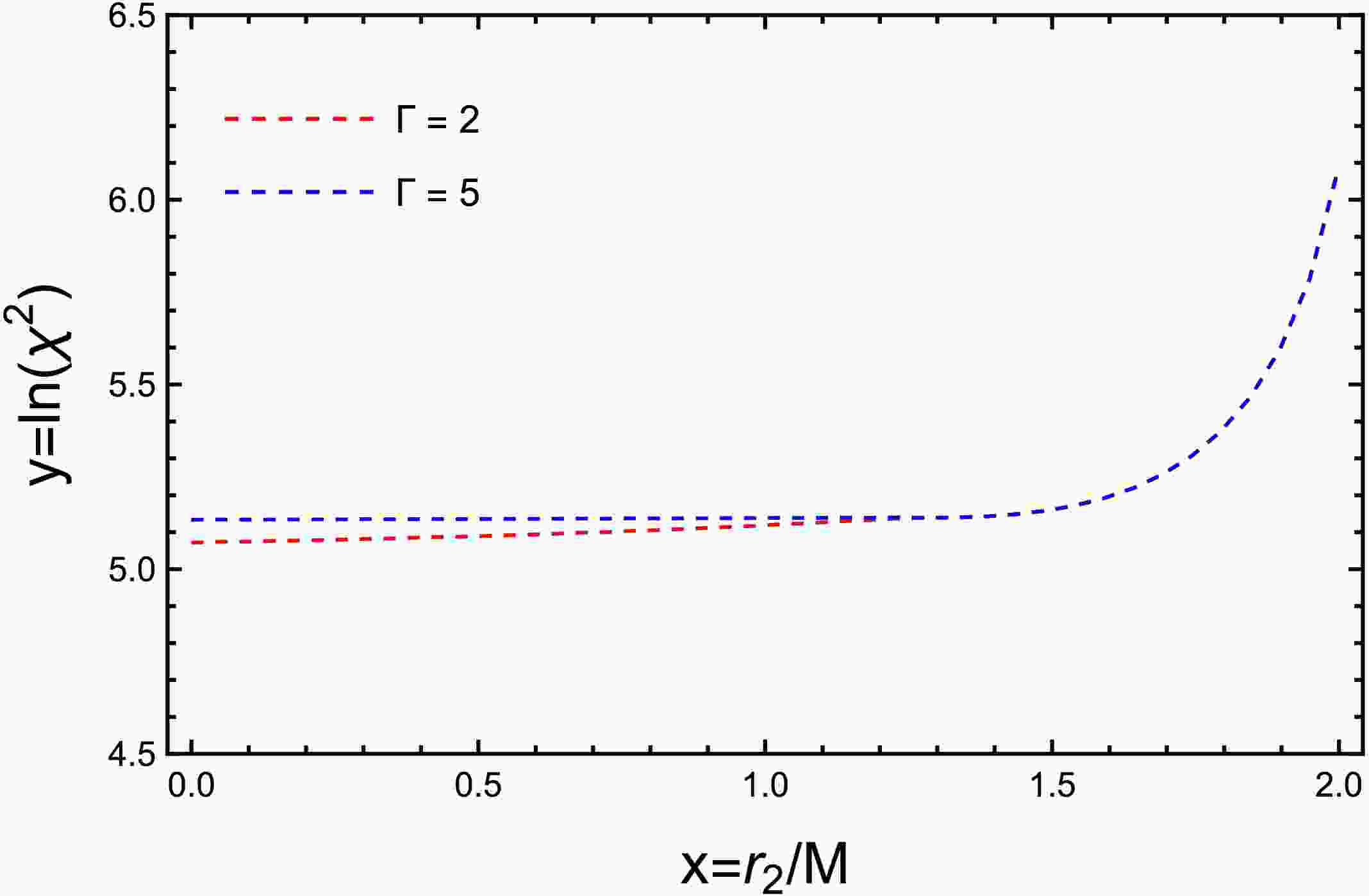 $ \chi^2 $ with the dilaton parameter$ r_2 $ for six binary BHs. The red dashed line represents the situation when$ P_{\text{jet}} $ corresponding to$ \Gamma=2 $ is used to calculate the$ \chi^2 $ , while the blue dashed line is associated with the scenario when$ P_{\text{jet}} $ corresponding to$ \Gamma=5 $ is considered for evaluating the$ \chi^2 $ .The Fig. 4 illustrates the variation of the logarithm of the