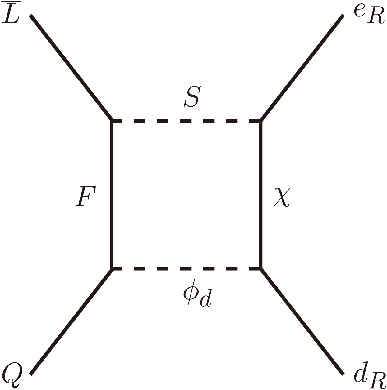 $ \begin{aligned}[b] {\cal{L}}=\;&f_{LS}(\bar{L} F_R) S^* + f_{\chi S}(\bar{\chi}_L e_{R}) S \\ &+ f_{FQ}(\bar{F}_R Q) \phi_d^* + f_{d\chi}(\bar{d}_R \chi_L) \phi_d + \text{h.c.}, \end{aligned} $
