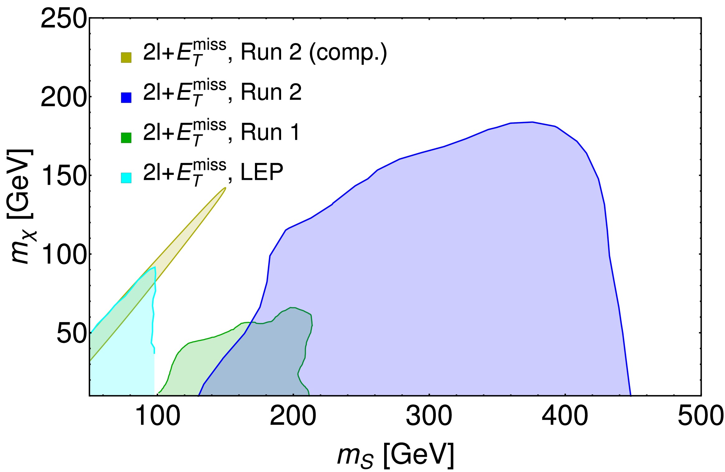 $ +\not E_T $ searches at the LHC Run 1 ($ 8 \; \text{TeV} $ ,$ 20.3 \; \text{fb}^{-1} $ ) [59], Run 2$ (139 \; \text{fb}^{-1}) $ in the scenarios of$ m_\chi \lt m_S $ [57] and$ m_S - m_\chi \ll m_S $ (compressed) [58], respectively. The cyan region excluded by the LEP is taken from Ref. [37].Besides the dilepton