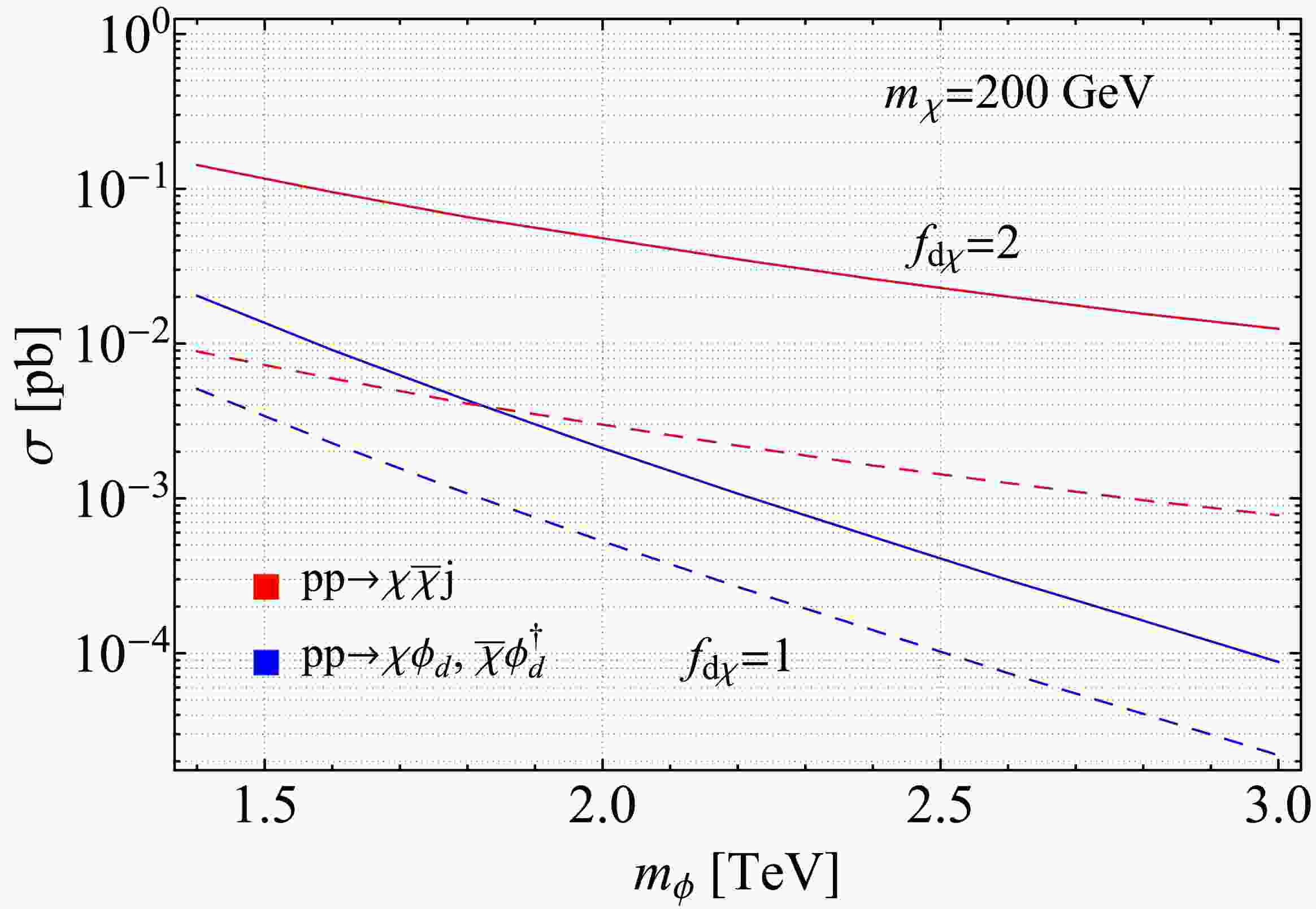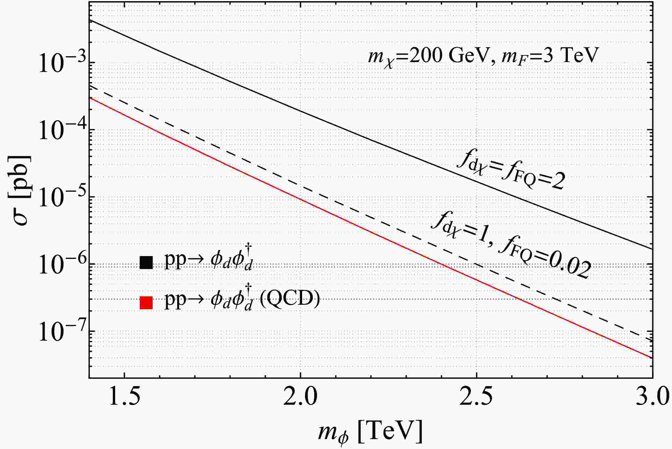 $ +\not E_T $ channel with two jets at the parton level, the DM χ is produced from the decay of colored mediator$ \phi_d $ . In Fig. 13, we show the representative diagrams for the production via QCD or new physics interactions, respectively. The cross section for the QCD production of$ \phi_d \phi_d^\dagger $ (red line), and benchmark cross sections for the new physics production at the 13 TeV LHC under the assumptions of$ m_\chi=200 \; \text{GeV} $ ,$ m_F=3 \; \text{TeV} $ , and$ f_{d\chi}=f_{FQ}=2 $ (black thick line), or$ f_{d\chi}=1 $ ,$ f_{FQ}=0.02 $ (black dashed line) are illustrated in Fig. 14. We find that the total production cross section is significantly enhanced for substantial new physics couplings, which agrees with the findings in Ref. [15]. In our parameter space of interest, the cross section of new physics production always dominates over that of QCD production.