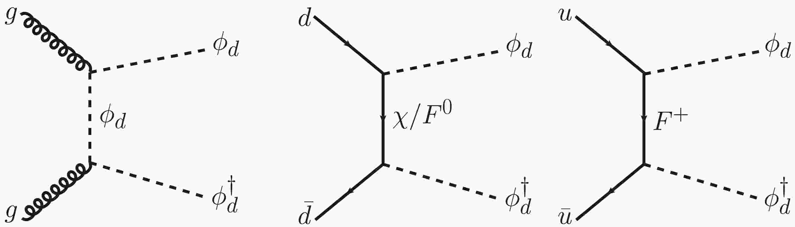 $ pp\to F^0 \bar{F}^0 $ ,$ F^0 \to S^+ \ell^- $ ,$ \bar{F}^0 \to S^- {\ell}^+ $ ,$ S^\pm \to \mu^\pm \chi $ ,$ \ell = e $ or μ.The corresponding Feynman diagrams for the production of
