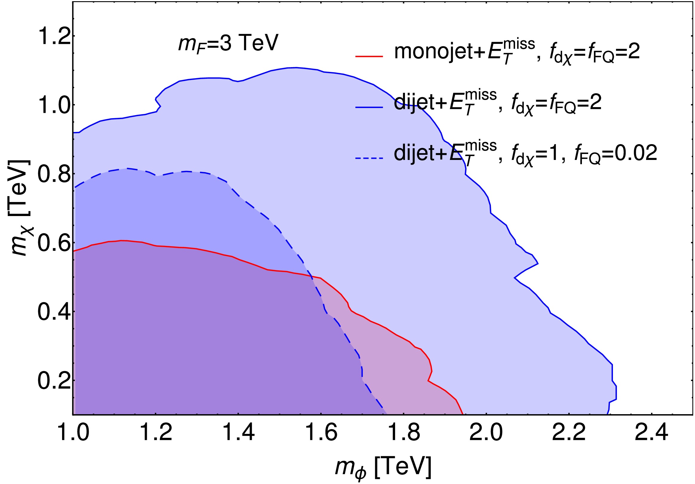 $ m_F=3 \; \text{TeV} $ 2 with different choices of the new physics couplings. The blue shaded areas with solid and dashed curves correspond to dijet search with$ f_{d\chi} = f_{FQ} = 2 $ and$ f_{d\chi} =1 $ ,$ f_{FQ} = 0.02 $ , respectively. The constraints from the dijet search are stricter than those from the monojet search with the same choice of$ f_{d\chi} $ and$ f_{FQ} $ . We find that the most stringent limits on the colored mediator mass from the jet(s)$ +\not E_T $ searches in our parameter space are$ m_\phi \geq 2.3 \; \text{TeV} $ and$ 1.76 \; \text{TeV} $ , respectively. -