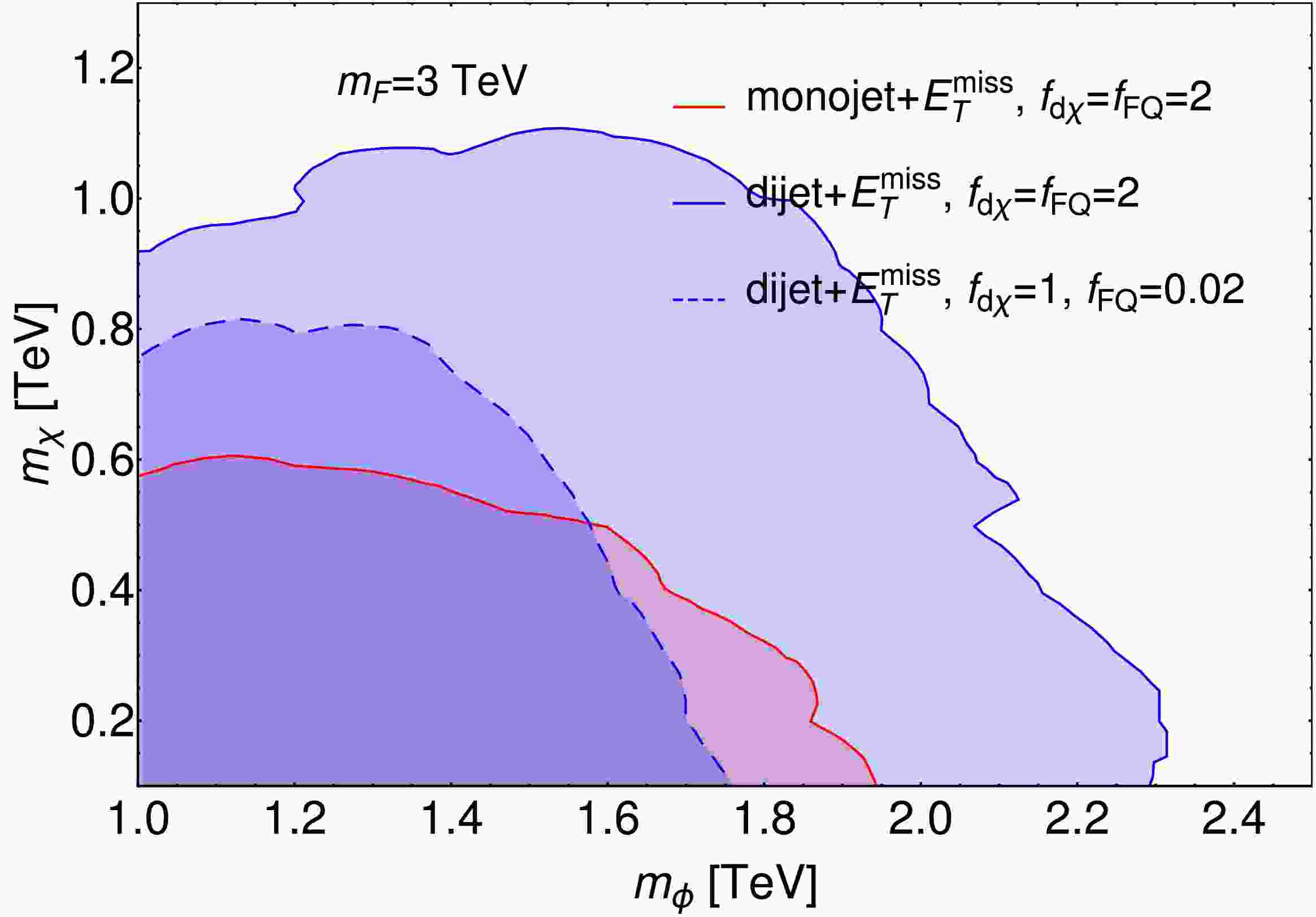 $ +\not E_T $ [63] and dijet$ +\not E_T $ [63] searches at the LHC Run 2$ (139 \; \text{fb}^{-1}) $ , respectively, for the assumptions of$ f_{d\chi} = f_{FQ}=2 $ (solid curves) or$ f_{d\chi}=1 $ ,$ f_{FQ}=0.02 $ (dashed curve), with$ m_F=3 \; \text{TeV} $ being fixed. -