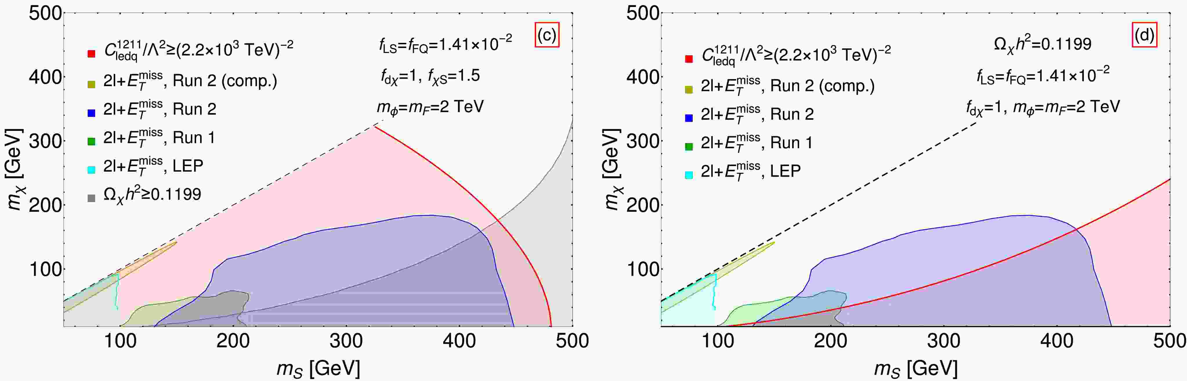 $ f_{\chi S} $ is considered as an independent parameter, the model-independent constraints on the Wilson coefficients$ C_{ledq}^{22 11} $ and$ C_{ledq}^{12 11} $ provide a complementary investigation of the parameter space of the DM mass$ m_\chi $ and scalar mass$ m_S $ , which extends the reaches of collider searches in the diplepton+$ \not{E}_T $ channel and DM direct detection, especially for the region where$ m_\chi $ and$ m_S $ are close.In the cases of BM (b) and BM (d), the coupling