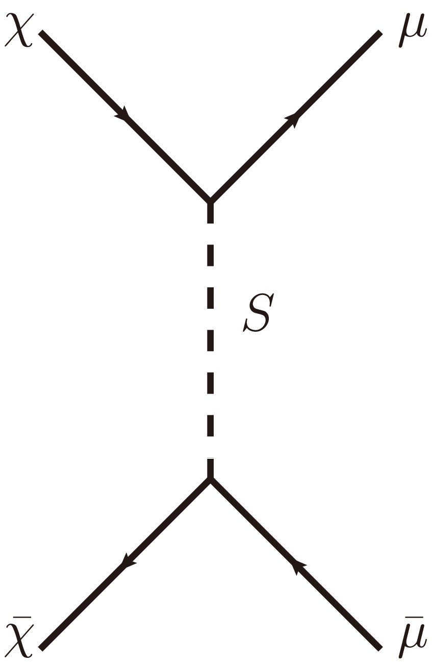 Given the Lagrangian in Eq. (2), the Majorana DM pair χ can annihilate to muon pair and d quark pair, mediated by S and