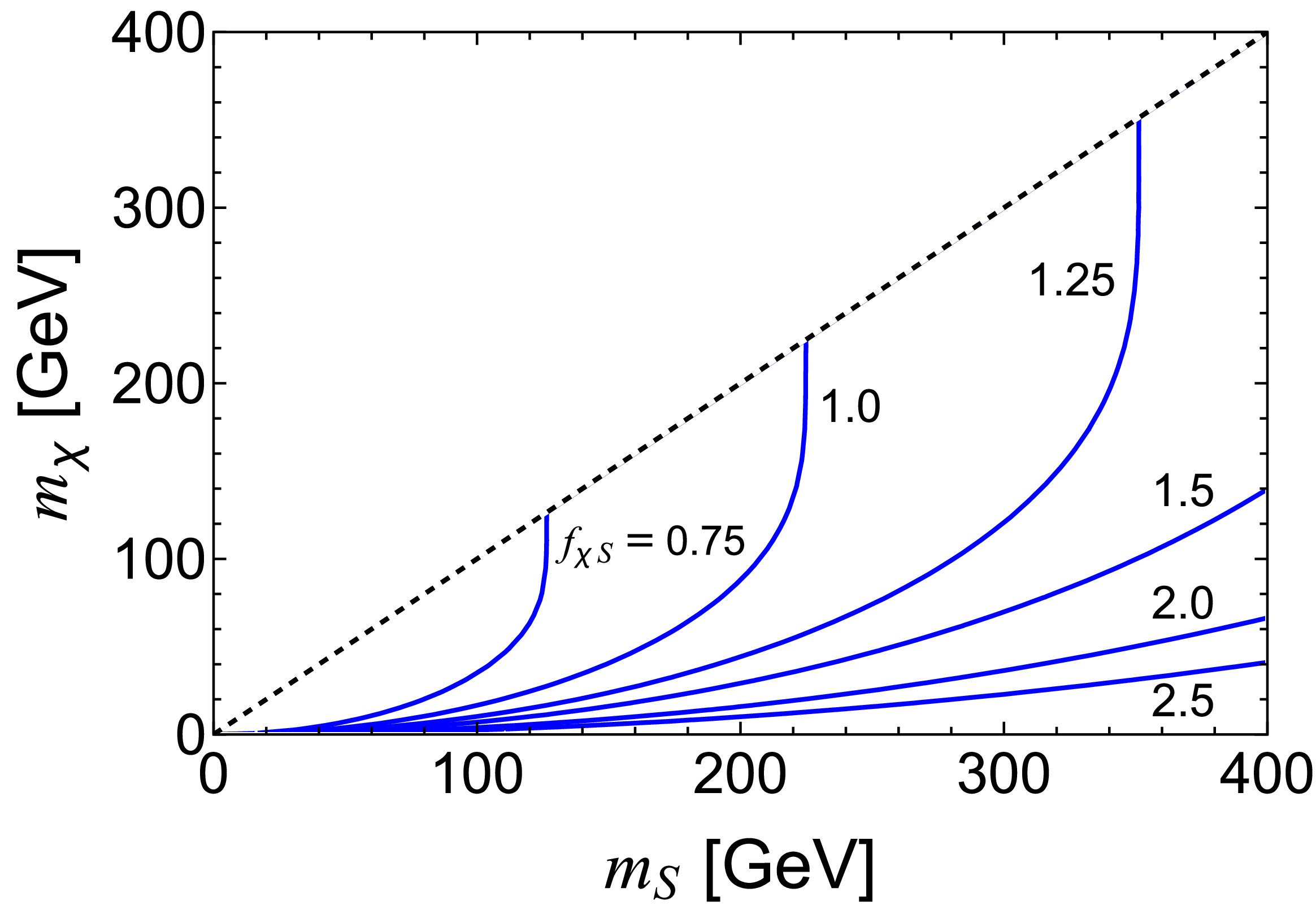 $ m_S $ and$ m_\chi $ with different choices of$ f_{\chi S} $ , considering the relic density$ \Omega_{\chi} h^2 = 0.1199 \pm 0.0022 $ [38]. Regions below the contour curves indicate overabundance.