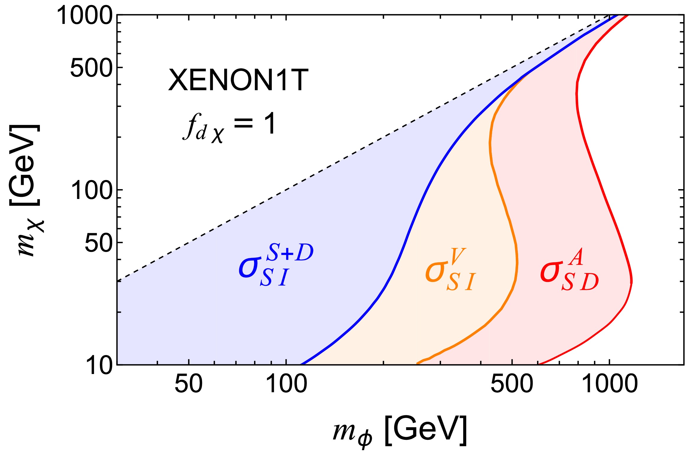 $ m_\chi $ and$ m_\phi $ for$ {\cal{O}}_V $ ,$ {\cal{O}}_A $ , and a combination of$ {\cal{O}}_S $ and$ {\cal{O}}_D $ by the XENON1T experiment with a 1 ton-year exposure [46, 52] under the assumption of$ f_{d\chi}=1 $ . The DM-nucleon SD cross section is attributed to the operator$ {\cal{O}}_A $ , while the SI cross sections from$ {\cal{O}}_V $ and the combination of$ {\cal{O}}_S $ and$ {\cal{O}}_D $ are analyzed separately.The suppression factor for the contributions to the SI cross section from the operators