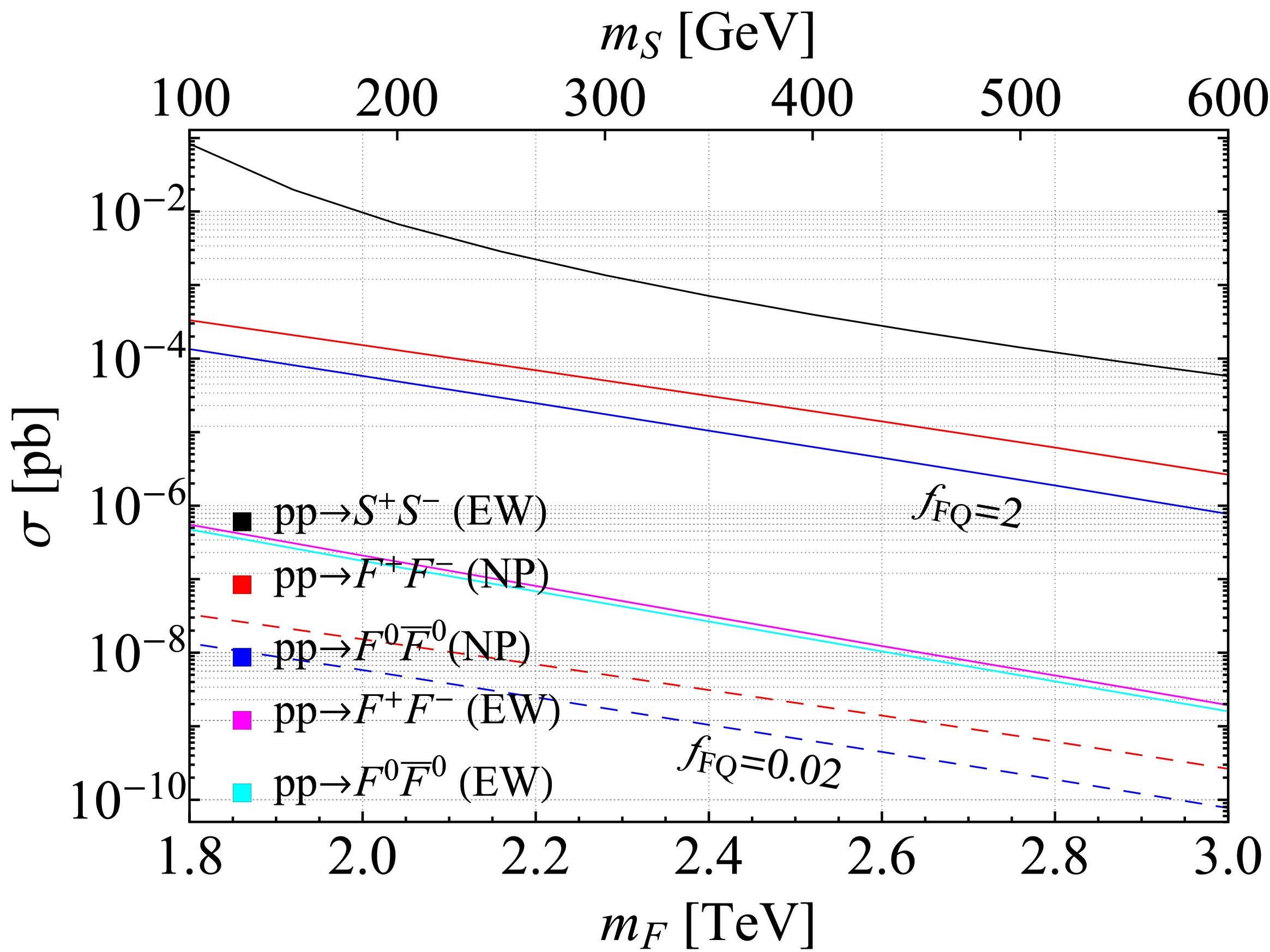 $ F^+ F^- $ and$ S^+ S^- $ at the 13 TeV LHC with the masses of F and S depicted in the lower and upper axes, respectively, for the assumption of$ m_\phi = 2.5 \; \text{TeV} $ . The new physics coupling$ f_{FQ} $ is assumed to be 2 (solid red, solid blue) or 0.02 (dashed red, dashed blue).Since the scalar