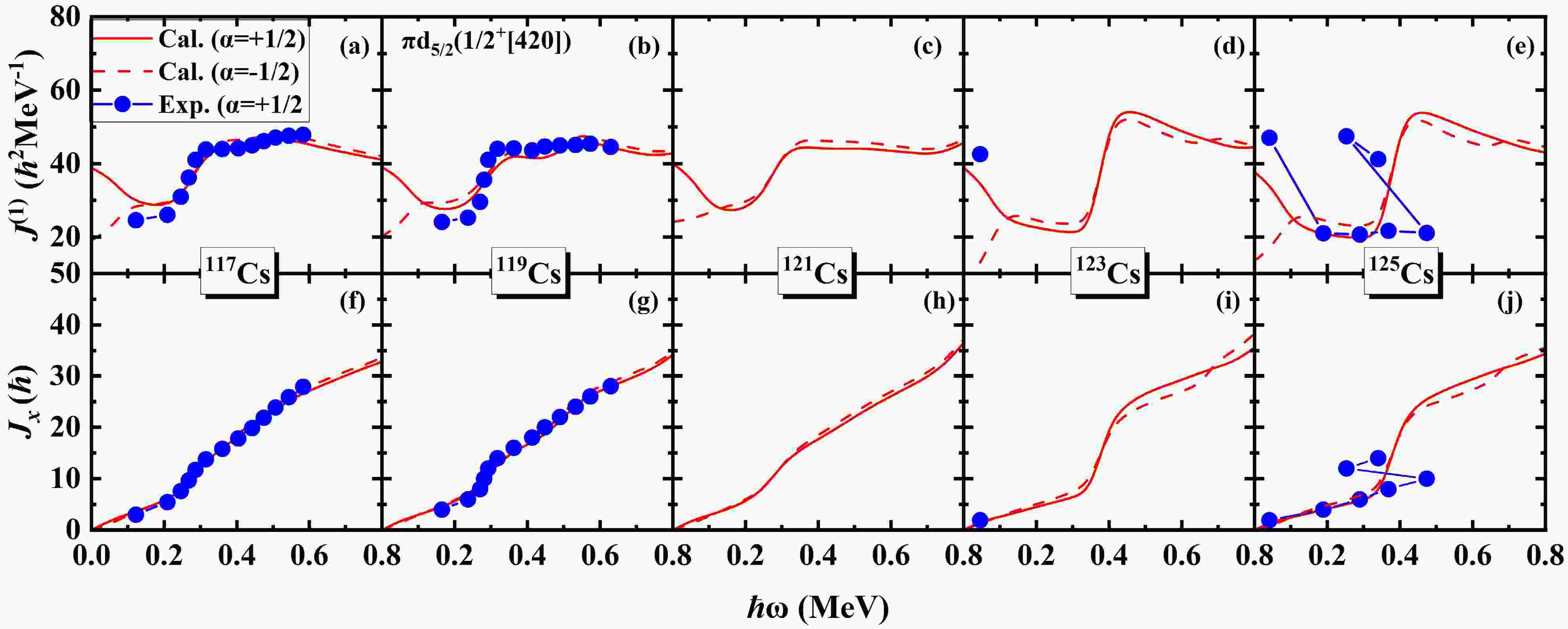 $ \pi g_{9/2} $ band in odd-A 119−125Cs nuclei are reasonably well reproduced within the framework of the particle-plus-rotor and particle-plus-vibrator models [18]. Cranked Shell Model (CSM) has been used to analyze the crossing frequencies for the$ \pi h_{11/2} $ band and the$ \pi g_{9/2} $ band in the odd-mass Cs isotopes[15]. Meanwhile, boson-fermion and core-quasiparticle coupling models have been used to describe the level structure in 123Cs [13]. Although these theories explain various experimental phenomena, the upbending and backbending observed in the$ \pi d_{5/2} $ band of odd-even 117−125Cs still requires further discussion.Comprehensive investigations of the rotational bands in the odd-mass 117−125Cs isotopes have produced an extensive set of experimental data. These analyses consistently reveal the occurrence of upbending and backbending phenomena in both the