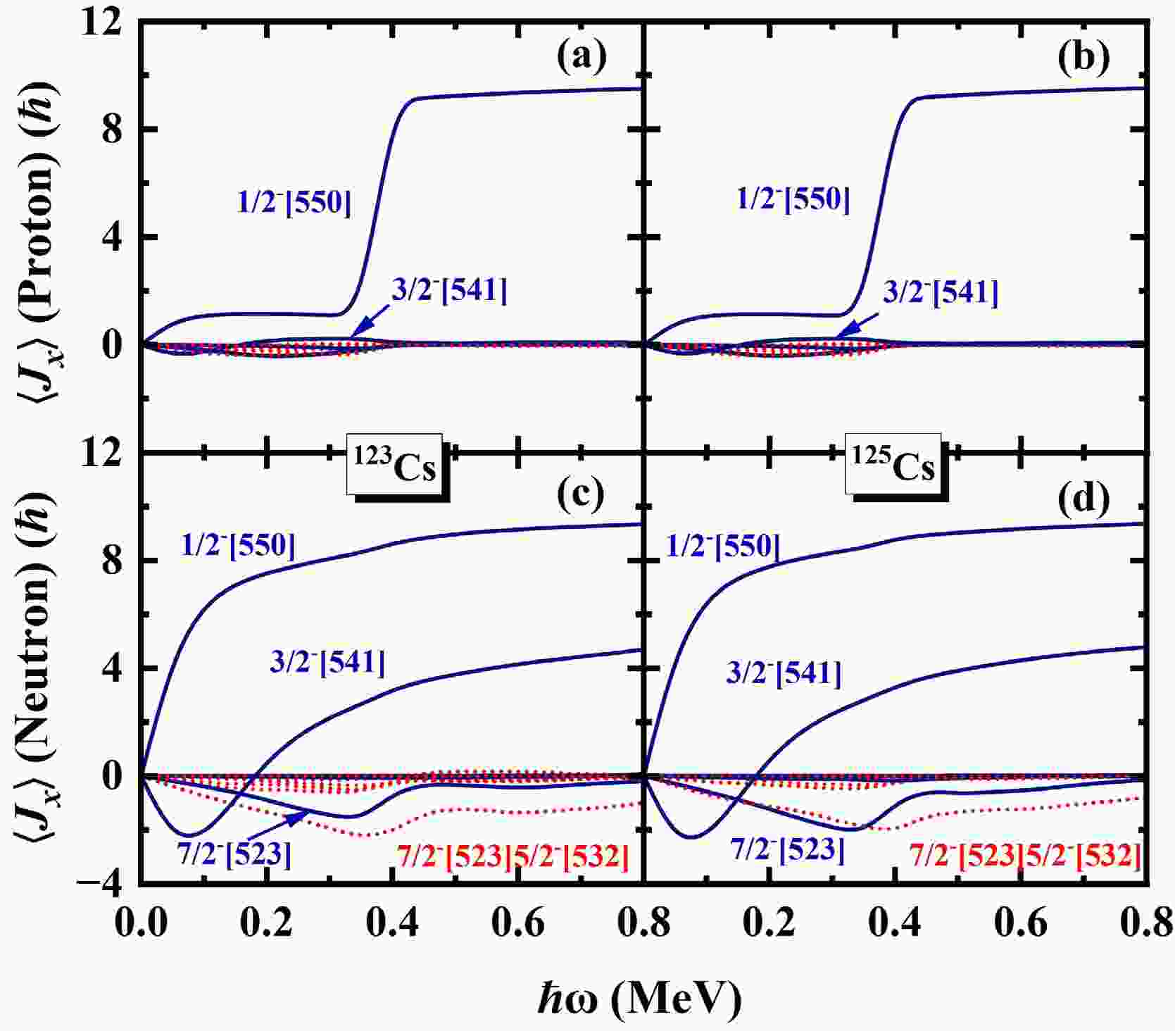 $ N=5 $ major shell to the angular momentum alignments$ \langle J_x\rangle $ for the$ \pi d_{5/2} (1/2^+[420]) $ band in odd-even 117−125Cs are presented in Fig.8 and Fig.9. The diagonal (off-diagonal) part$ j_{x}(\mu) $ $ (j_x(\mu\nu)) $ is denoted by blue solid lines (red dotted). In Fig.8 (a-c), around$ \hbar\omega \sim 0.20 $ MeV, it is evident that the off-diagonal contributions$ j_{x}(\pi5/2^{-}[532]\pi3/2^{-}[541]) $ and$ j_{x}(\pi1/2^{-}[550]\pi3/2^{-}[541]) $ increase significantly with increasing rotational frequency in 117,119,121Cs. These off-diagonal matrix elements are responsible for the first upbending observed in these nuclei. In Fig.8(d), it can be seen that the diagonal part$ j_{x}(\nu5/2^{-}[532]) $ and the off-diagonal parts$ j_{x}(\nu7/2^{-}[523]\nu5/2^{-}[532]) $ and$ j_{x}(\nu3/2^{-}[541]\nu5/2^{-}[532]) $ give contributions to the second upbending of 117Cs. In Fig.8(e), the second upbending of 119Cs is attributed to the off-diagonal parts$ j_{x}(\nu7/2^{-}[523]\nu5/2^{-}[532]) $ and$ j_{x}(\nu3/2^{-}[541]\nu5/2^{-}[532]) $ . In 121Cs, the second upbending is mainly driven by the off-diagonal part$ j_{x}(\nu1/2^{-}[541]\nu5/2^{-}[532]) $ . For 123,125Cs, the diagonal part$ j_{x}(\pi1/2^{-}[550]) $ increases from 2$ \hbar $ at$ \hbar \omega \sim0.30 $ MeV to 9$ \hbar $ at$ \hbar \omega \sim0.40 $ MeV. It gives the main contributions to the backbending of$ \pi d_{5/2} (1/2^+[420]) $ band in 123,125Cs. Moreover, the backbending is effected by neutron with the off-diagonal part$ j_{x}(\nu5/2^{-}[532]\nu7/2^{-}[523]) $ and diagonal part$ j_{x}(\nu7/2^{-}[523]) $ increasing little at$ \hbar \omega\sim0.30 $ MeV.