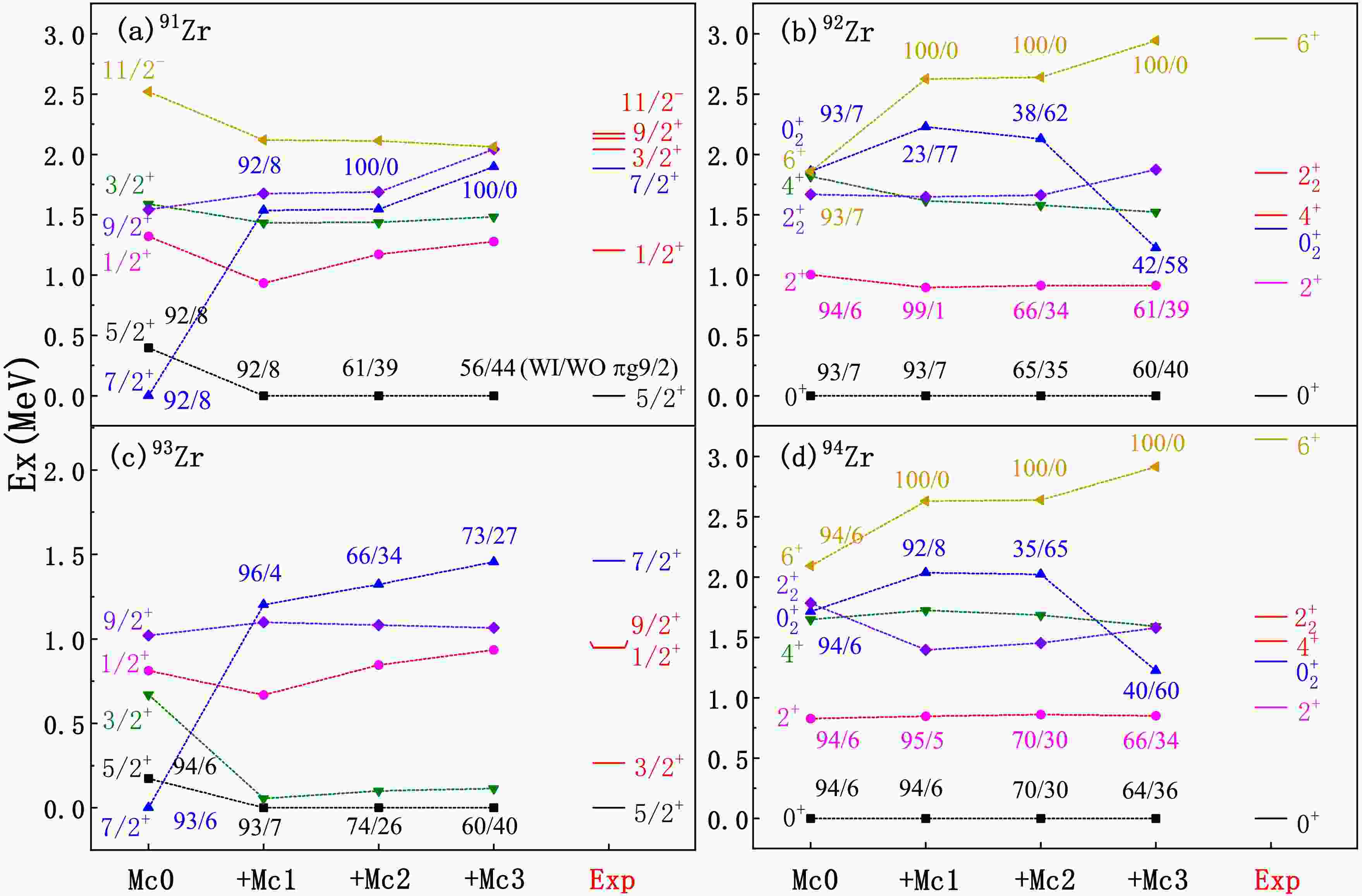Figure 1.  (color online) Monopole effects in the low-lying levels of $ ^{91-94} {\rm{Zr}}$, data from [29]. Label WI/WO is the ratio of with and without cross-subshell $ \pi g_{9/2} $.
