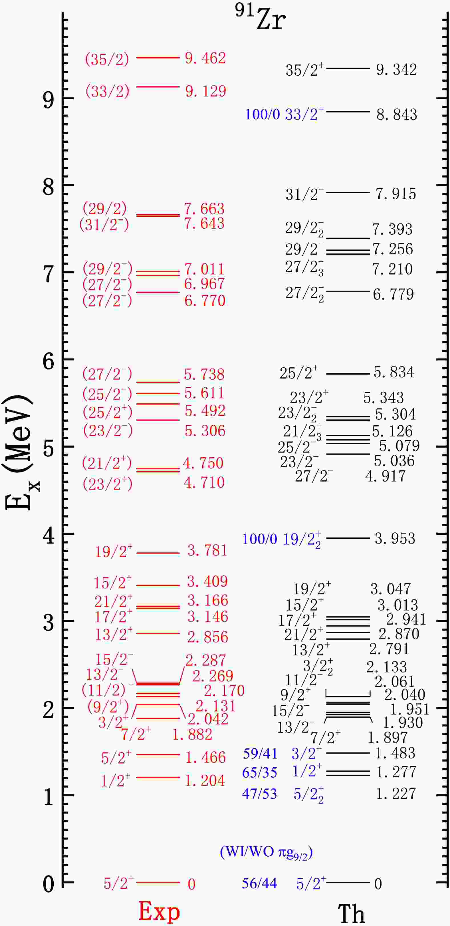 Figure 2.  (color online) Level spectra of 91Zr, data from [4448]. Label WI/WO is the ratio of with and without cross-subshell $ \pi g_{9/2}$