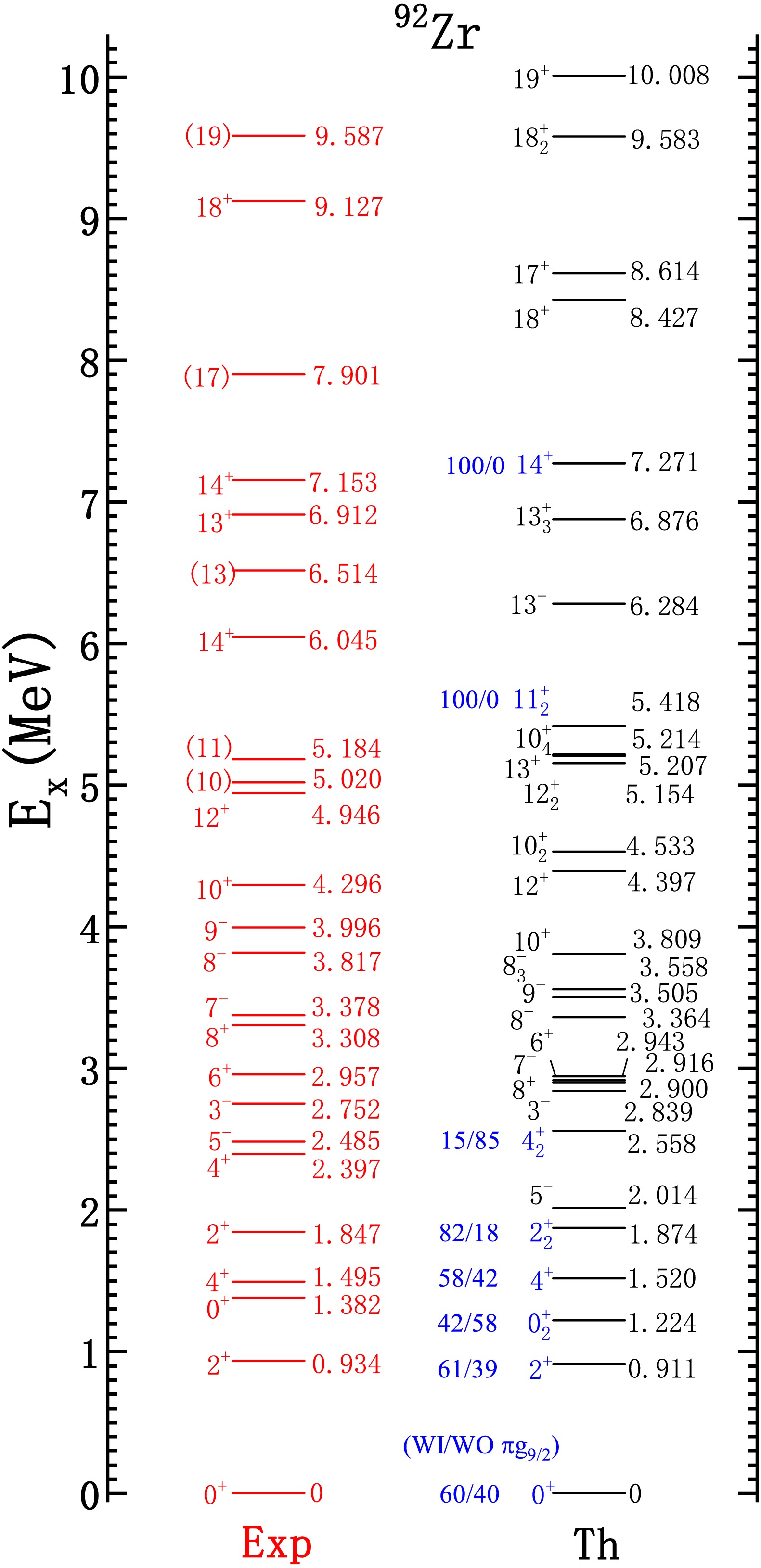 Figure 3.  (color online) Level spectra of 92Zr, data from [4955]. Label WI/WO is the ratio of with and without cross-subshell $ \pi g_{9/2}$.
