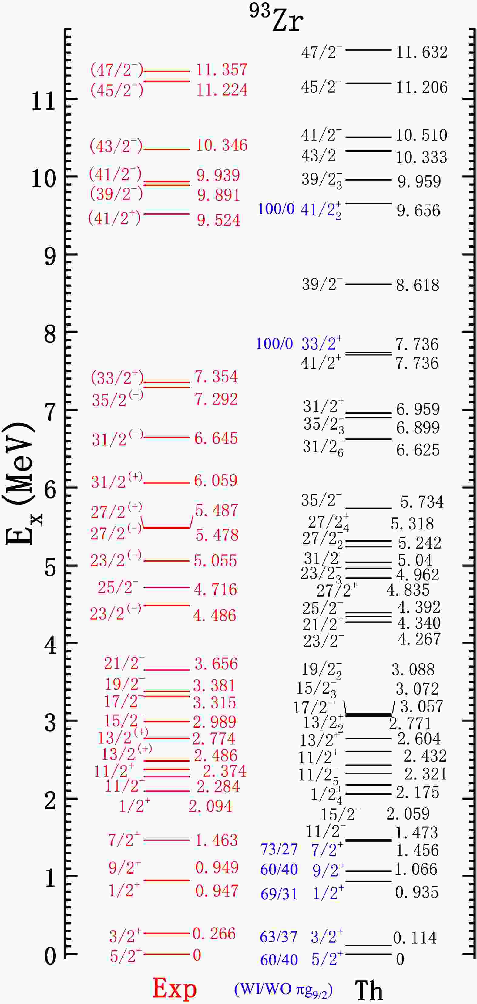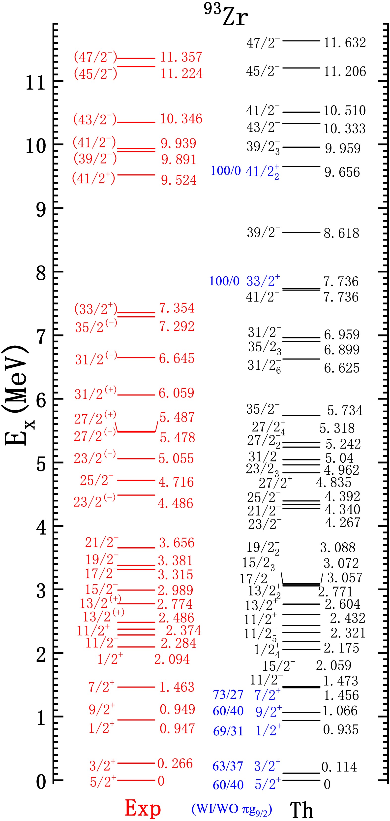 Figure 4.  (color online) Level spectra of 93Zr, data from [54, 56, 6062]. Label WI/WO is the ratio of with and without cross-subshell $ \pi g_{9/2}$.