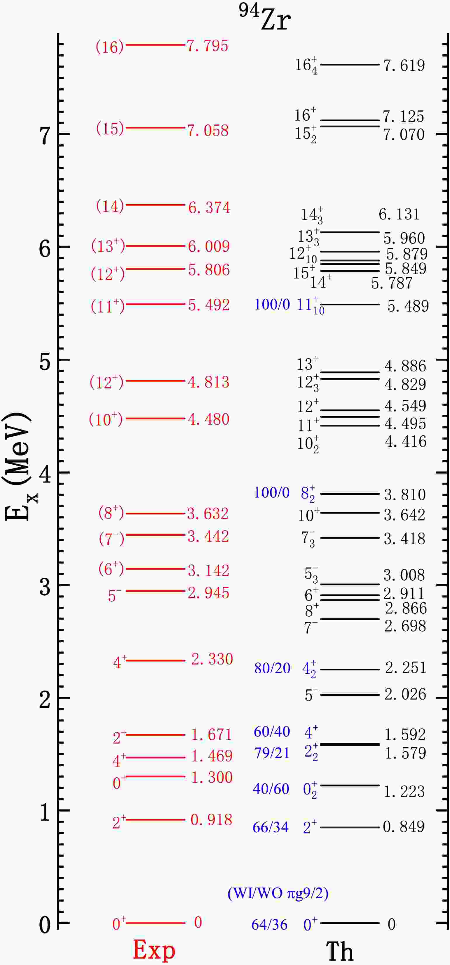 Figure 5.  (color online) Level spectra of 94Zr, data from Refs. [54, 6265]. Label WI/WO is the ratio with and without cross-subshell $ \pi g_{9/2}$